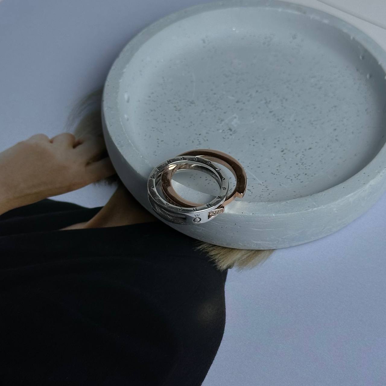 Основна частина каблучки виконана з благородного металу, який має надзвичайну міцність і блиск. Другий колір додає особливого шарму і робить дизайн ще більш вишуканим. Цей контраст підкреслює витонченість і вміння поєднувати різні стилі у одному аксесуарі.