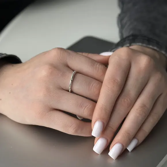 Основу каблучки складає благородний метал, майстерно оброблений для досягнення текстурованого вигляду. Цей дизайн додає глибини та об'єму прикрасі, роблячи її ще більш цікавою та стильною. Метал має приємний на дотик фініш, який підкреслює його високу якість та естетичну привабливість.