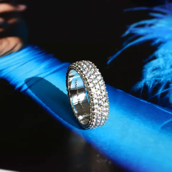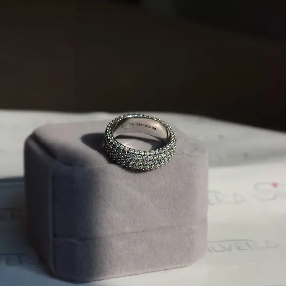 Каблучка вражає своїм дизайном "Три ряди паве", де кристали розташовані вишукано та додають блискучий ефект. Ця прикраса ідеально підходить для створення елегантного вигляду на будь-який випадок.