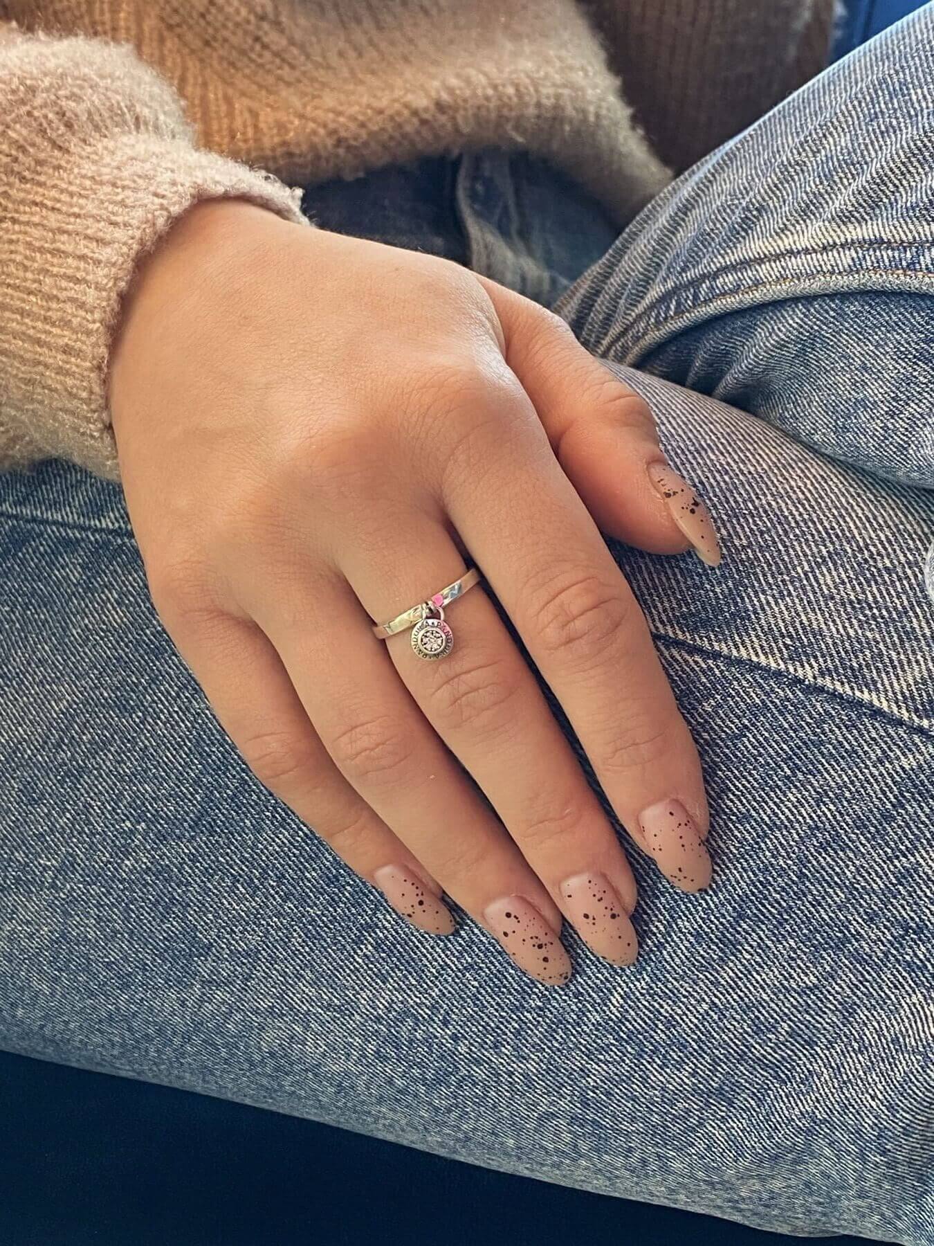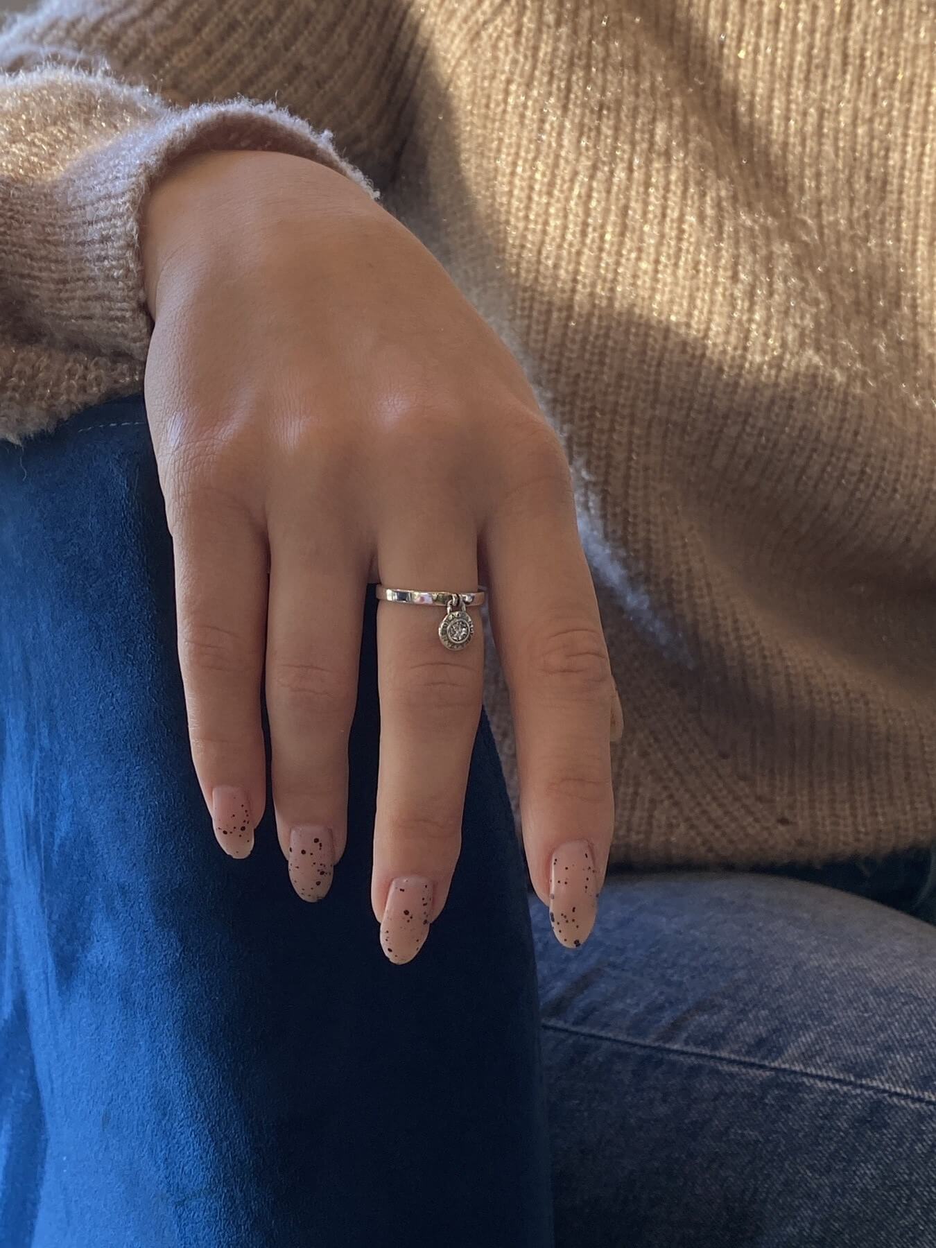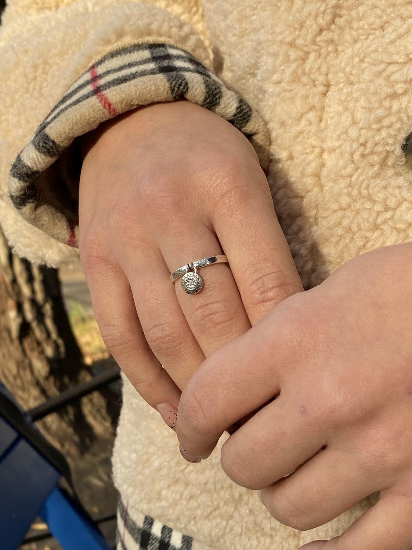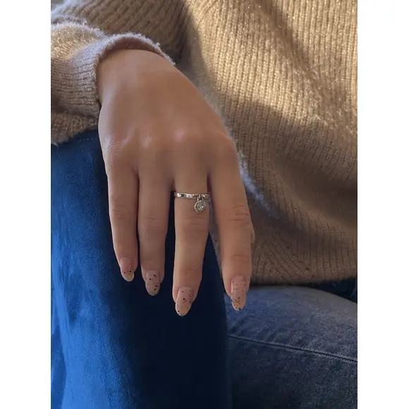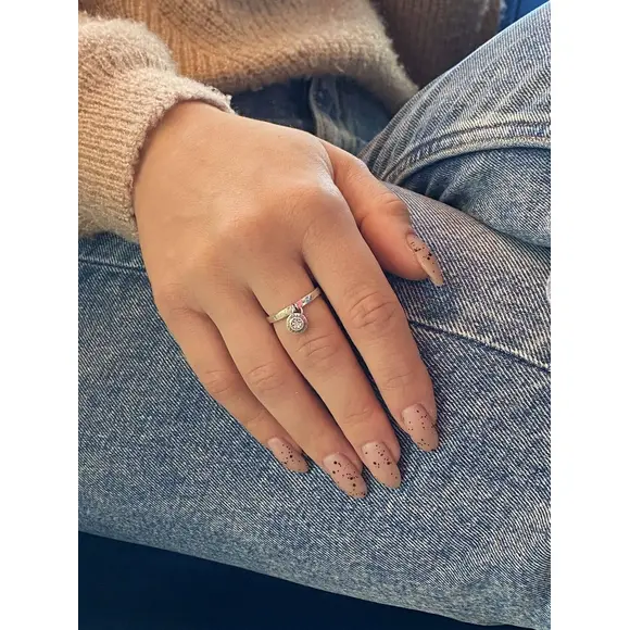 Особливістю цієї каблучки є маленька кругла підвіска, яка м'яко звисає з кільця, додаючи динамічності та грайливості загальному вигляду. Підвіска може мати різноманітний дизайн – від мінімалістичного до інкрустованого дрібними коштовними камінчиками, що сяють при кожному русі. Така деталь додає прикрасі особливого шарму та робить її унікальною.