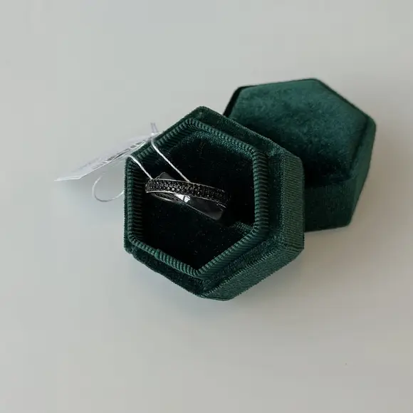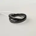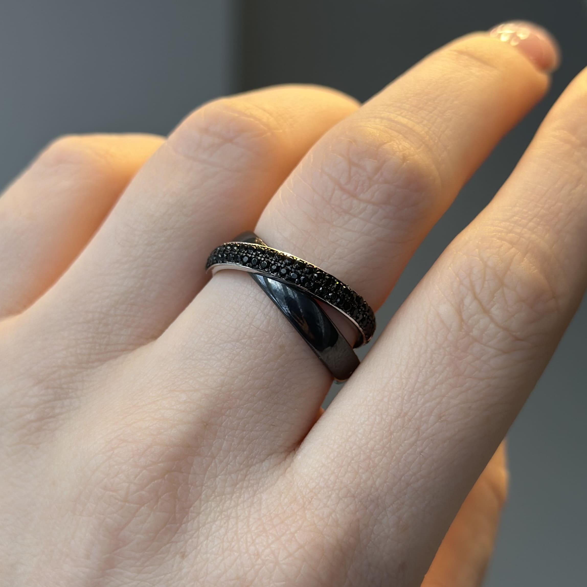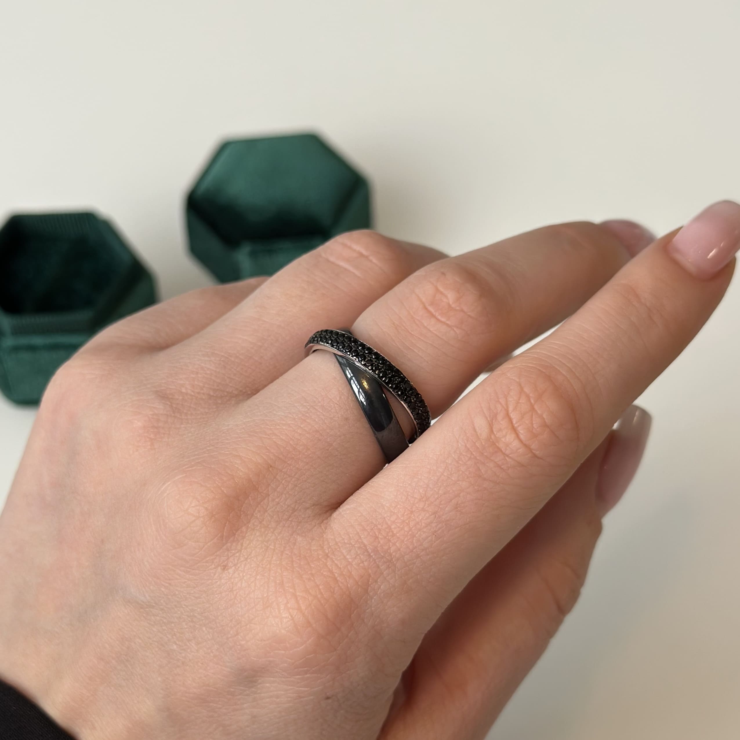Чорна каблучка з камінцями буде доречною як самостійний акцент, так і в поєднанні з іншими прикрасами в темній або сріблястій гамі. Вона підходить тим, хто шукає прикрасу з характером, але без надмірної декоративності. Це хороший вибір для прихильниць стилю total black, сучасної геометрії та мінімалістичних ювелірних форм.