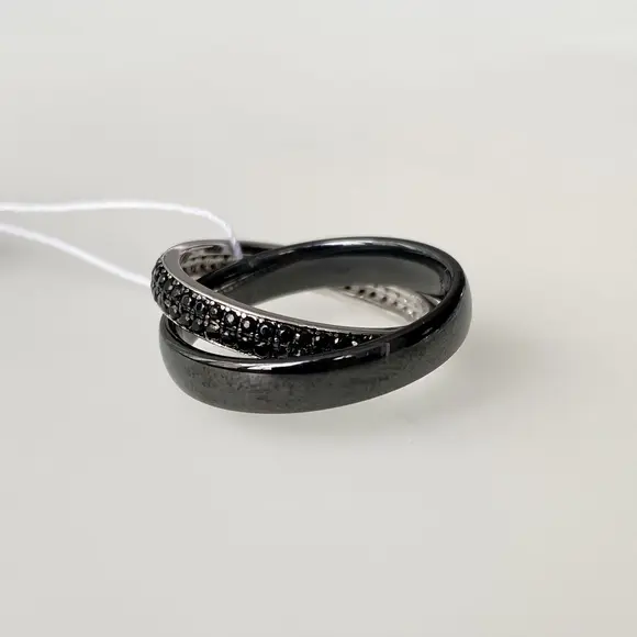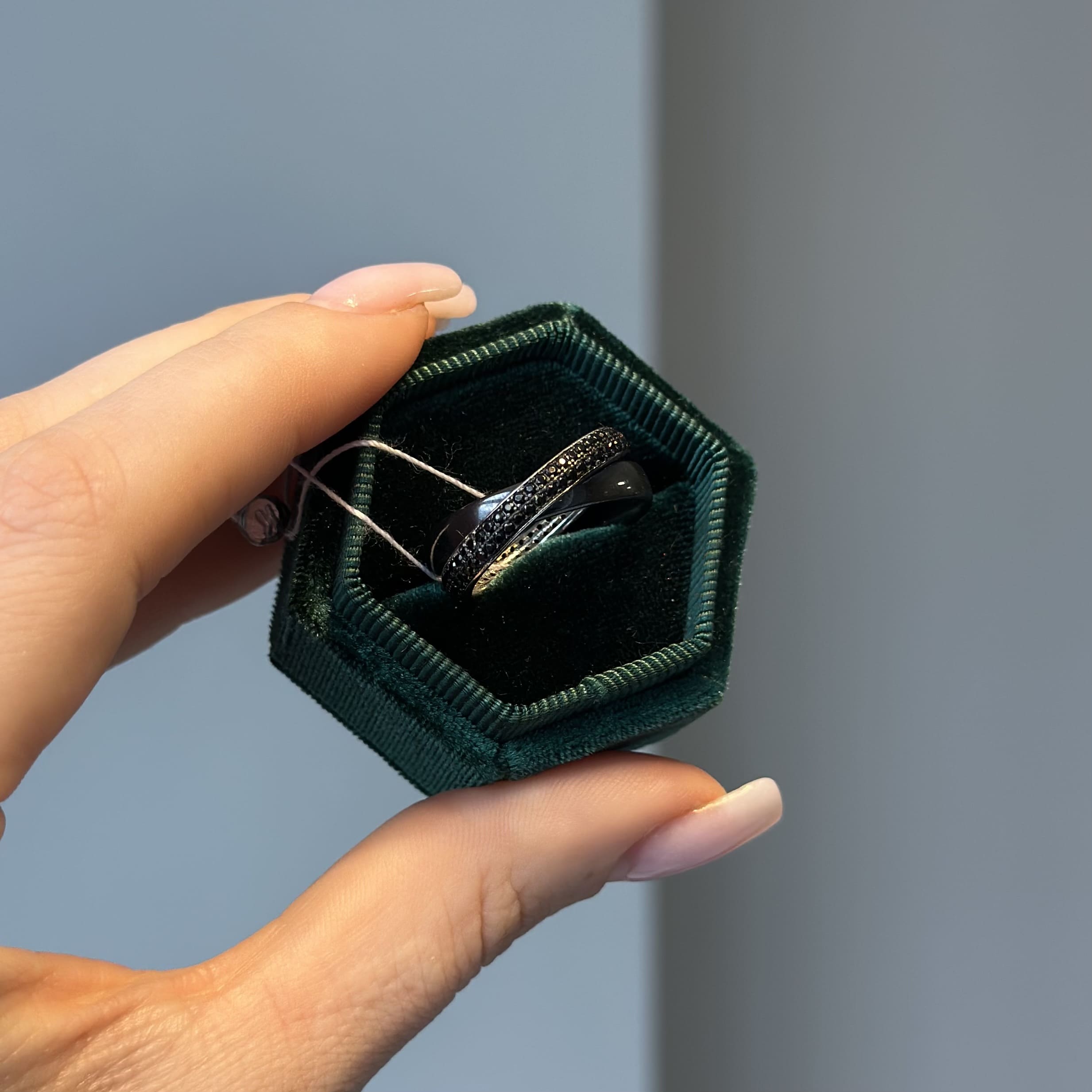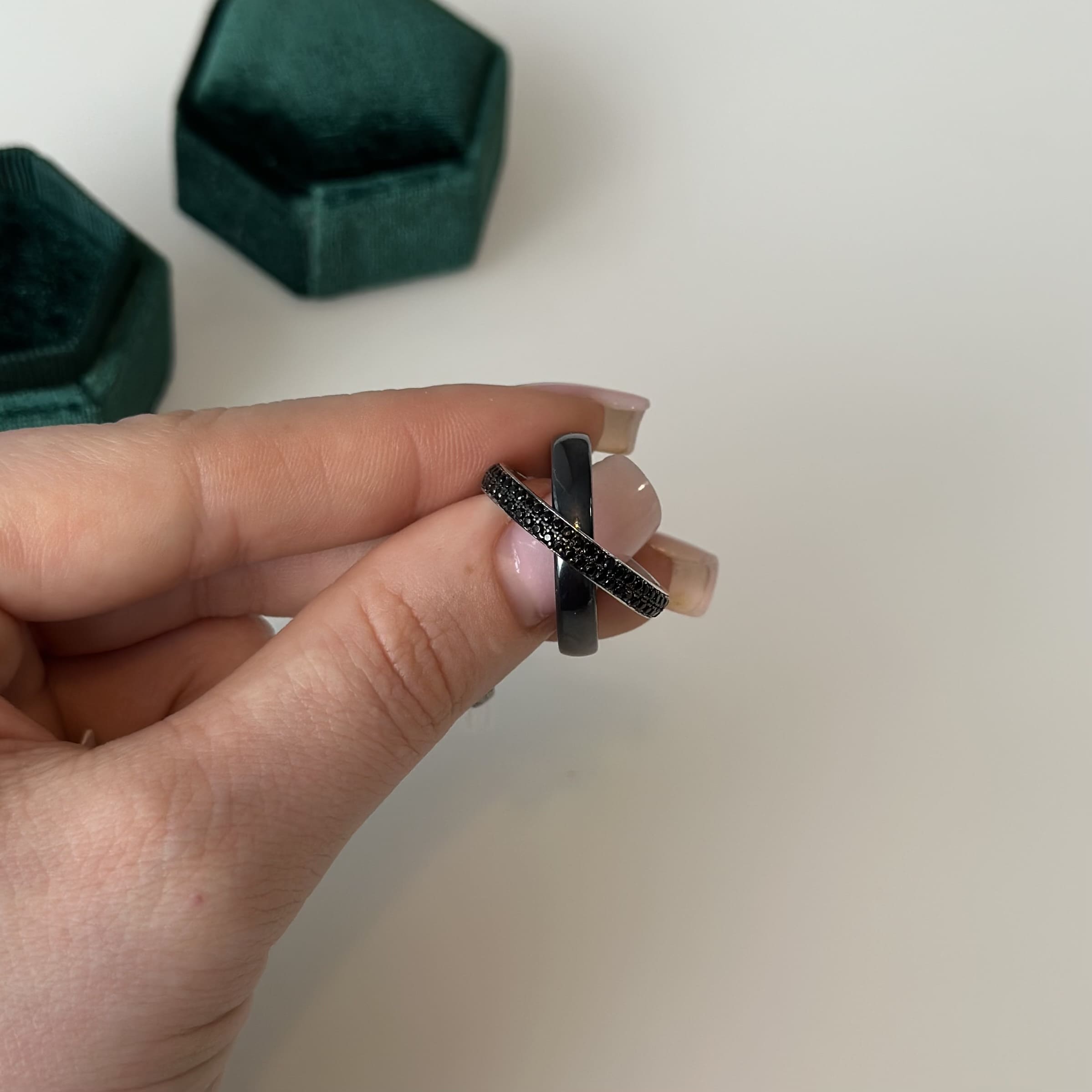 Головна особливість моделі — поєднання гладкої чорної кераміки та верхньої декоративної лінії з чорними камінчиками, які створюють ефект делікатного мерехтіння. Саме завдяки цьому каблучка Total Black виглядає не просто лаконічно, а дорого й продумано. Темний блиск поверхні додає прикрасі глибини, а чорне паве підсилює відчуття цілісного, стильного образу.