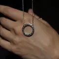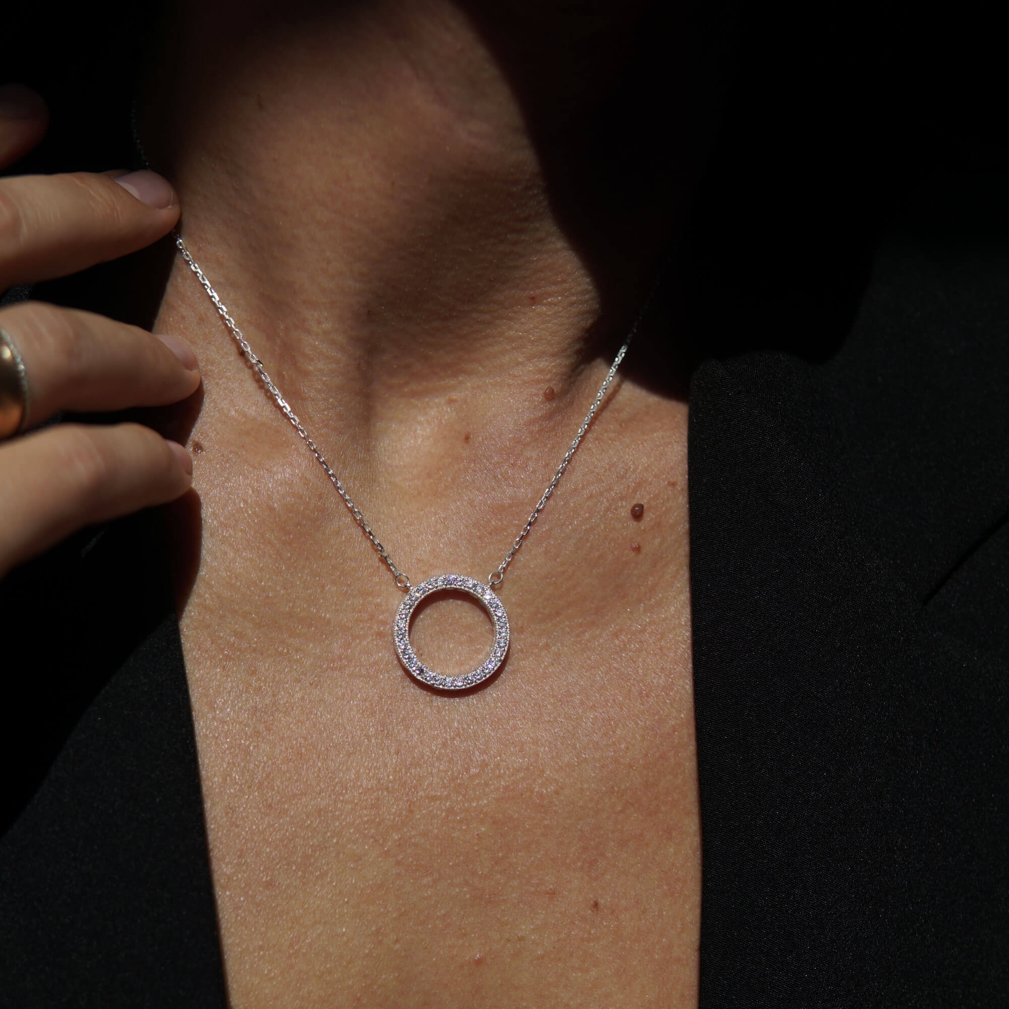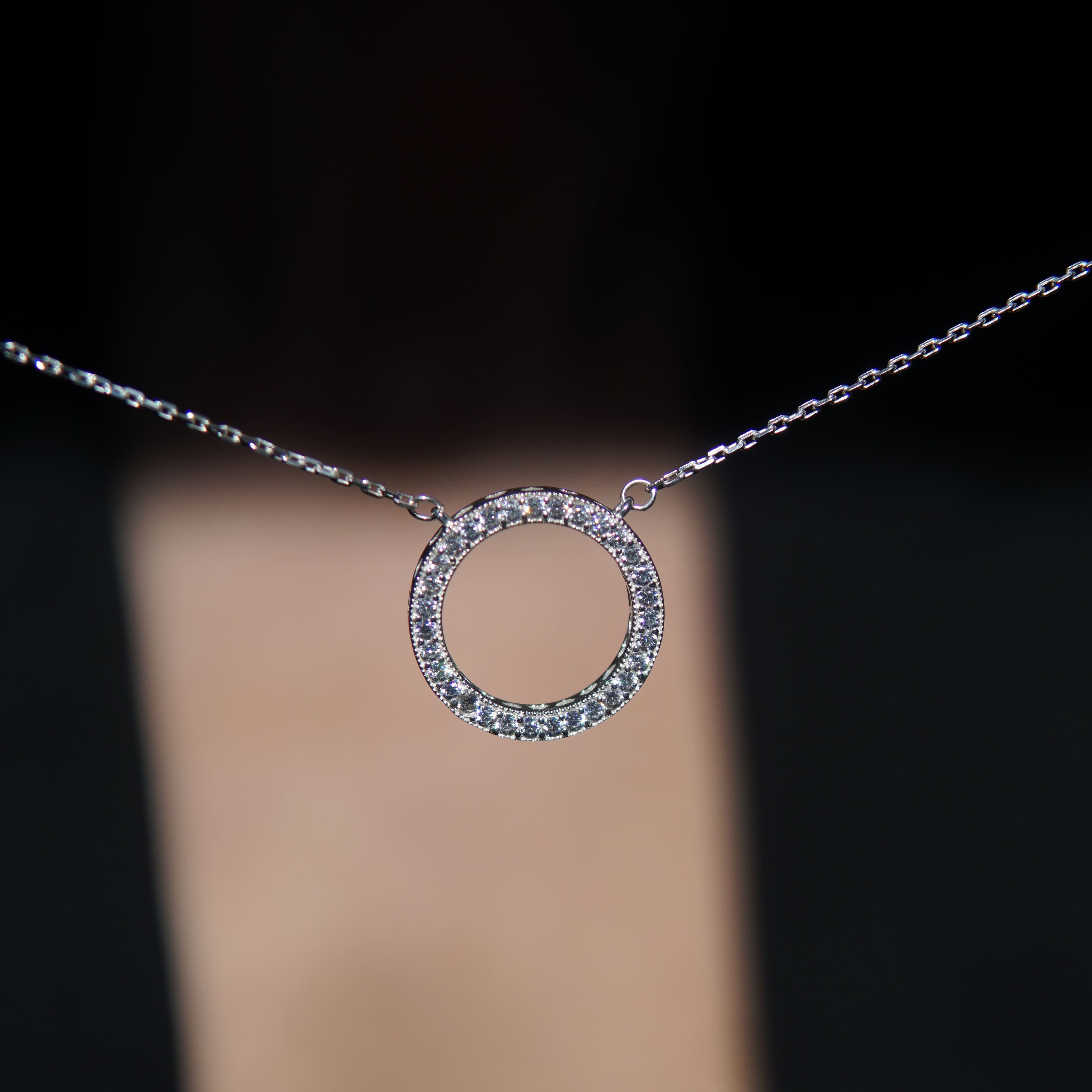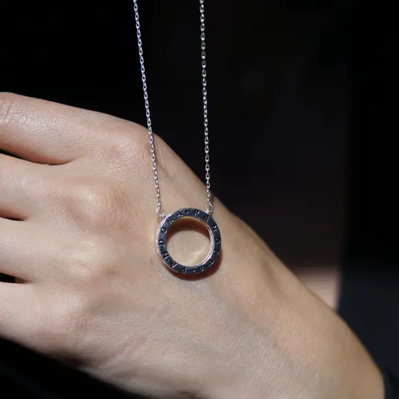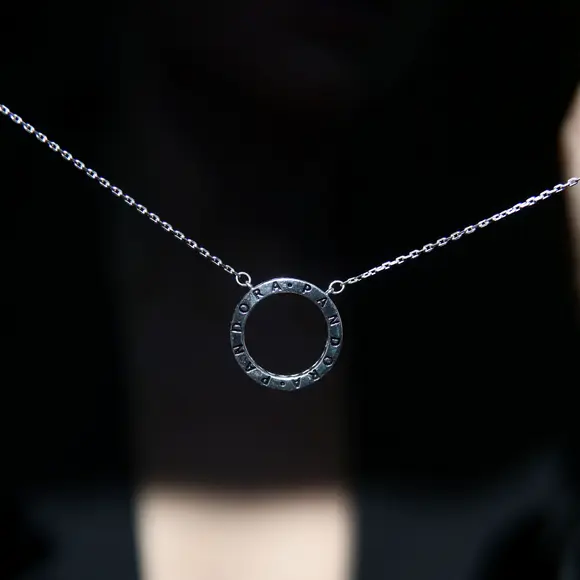 Центральний акцент — ідеально рівне коло, інкрустоване фіанітами, що м’яко вловлюють світло при кожному русі. Легкий блиск каменів підкреслює шию, створюючи ніжний акцент, який водночас залишається універсальним. На звороті або біля застібки розташований логотип, що додає прикрасі відчуття індивідуальності та преміального стилю.