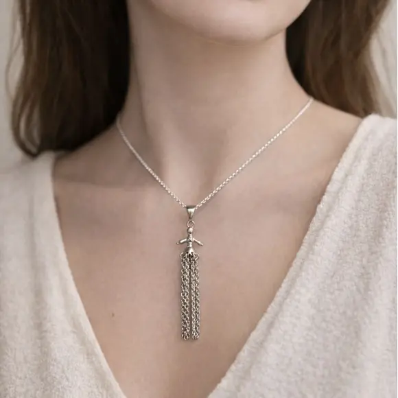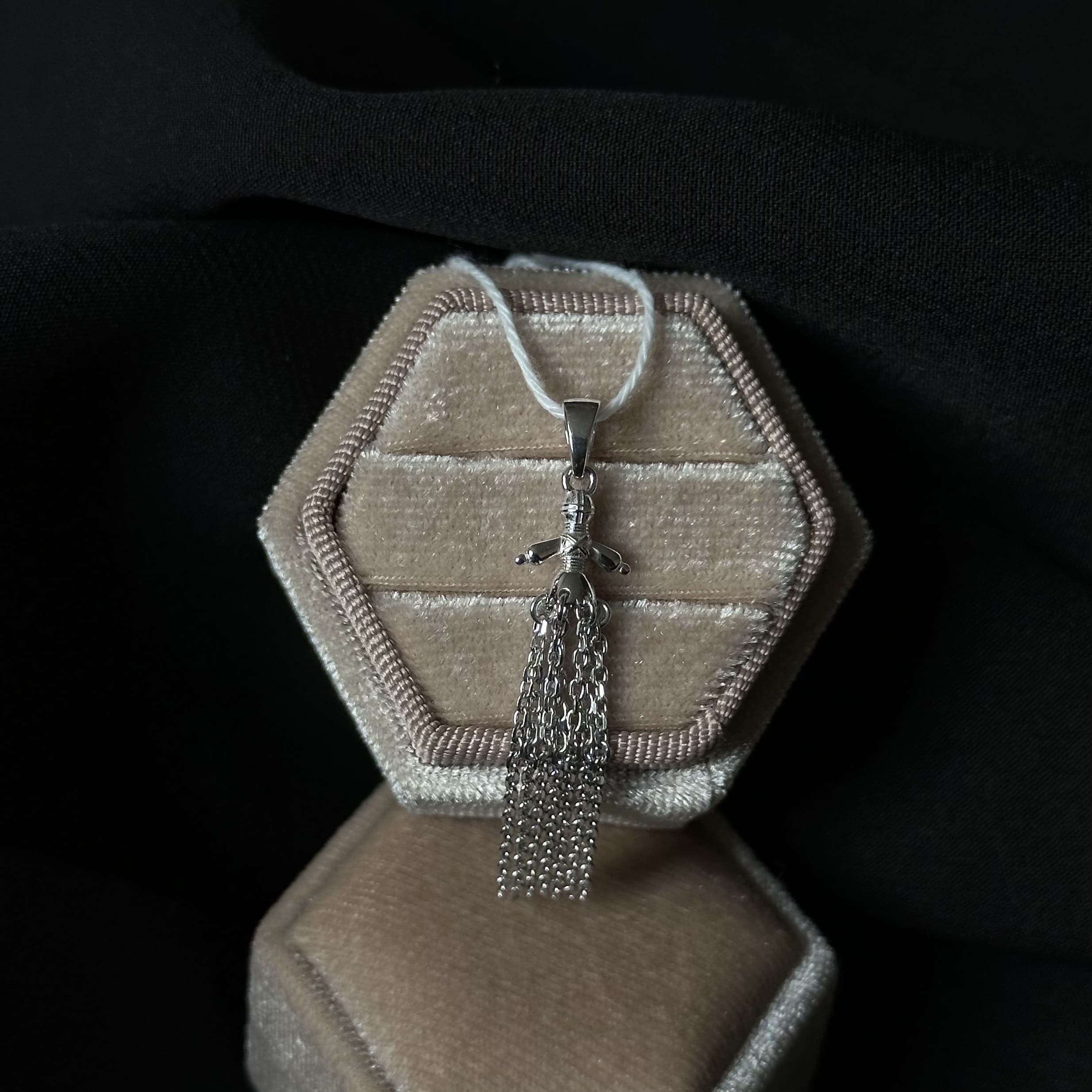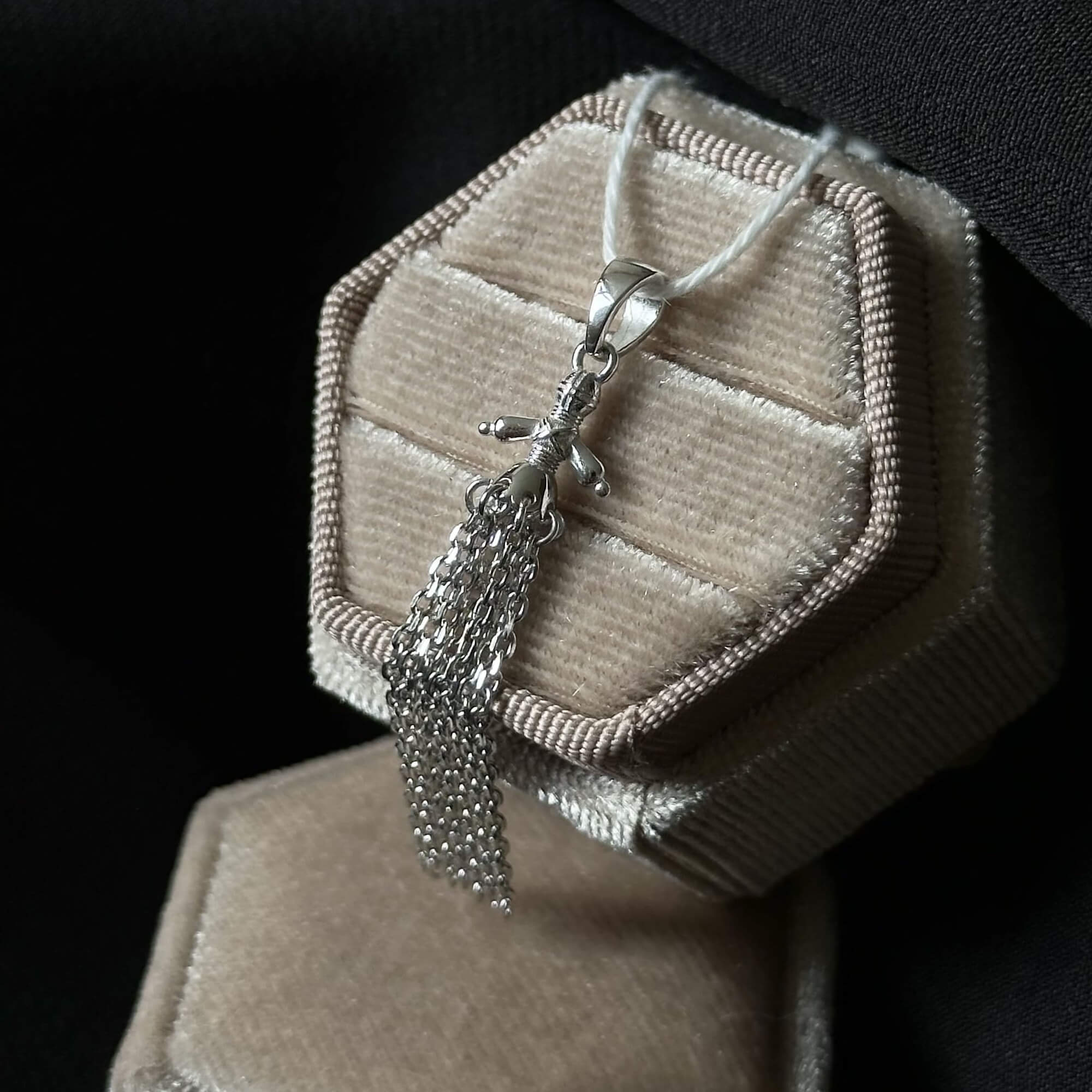 Ювеліри з великою увагою відтворили силует мотанки — з акуратними лініями, хрестом на місці обличчя, об’ємною спідницею та перев’язаними нитками, які утворюють форму оберегу. Срібло символізує чистоту, міцність і захист, тому така підвіска стає справжнім духовним амулетом. Її можна носити як на ланцюжку, так і на нитці чи шкіряному шнурку — так, як колись носили старовинні талісмани.