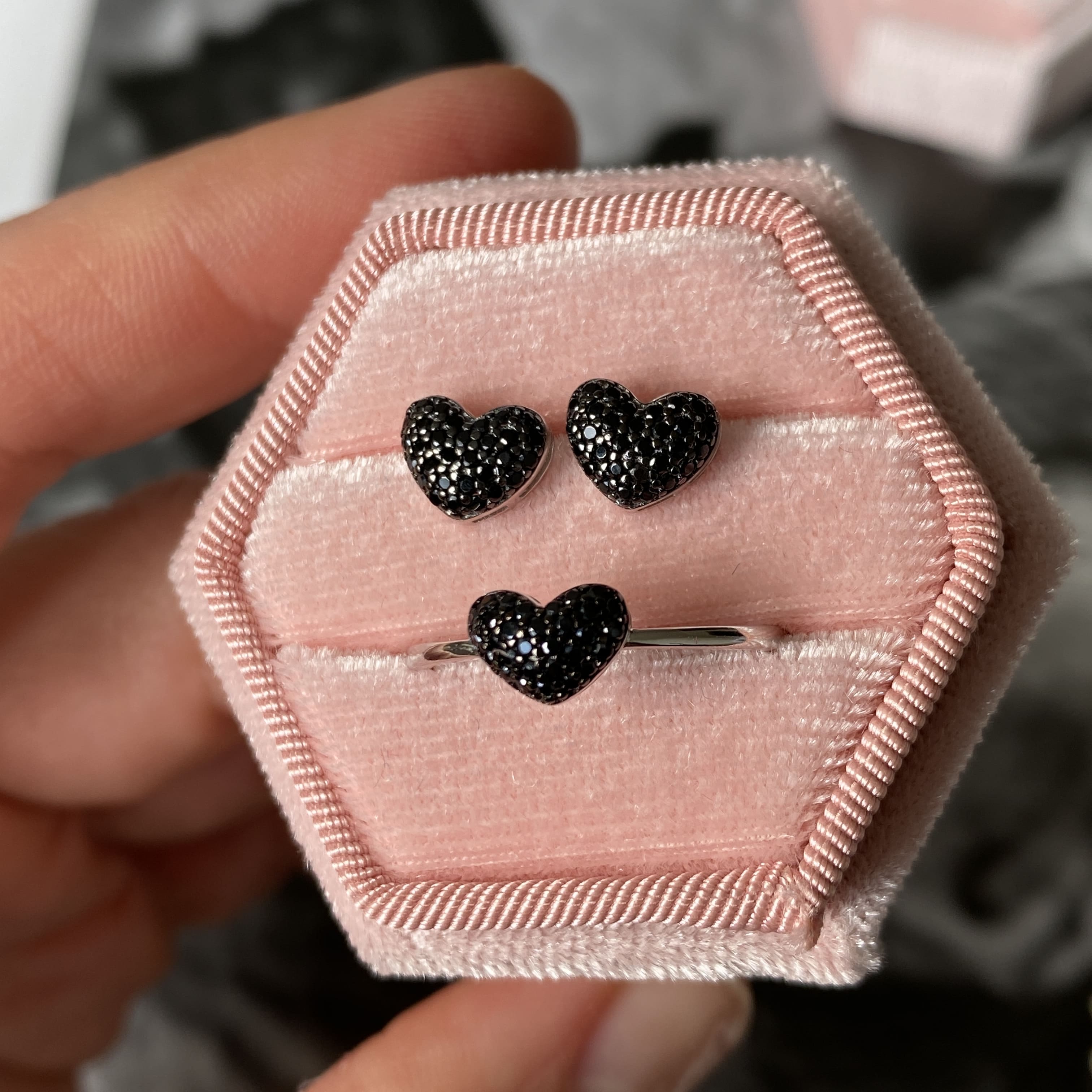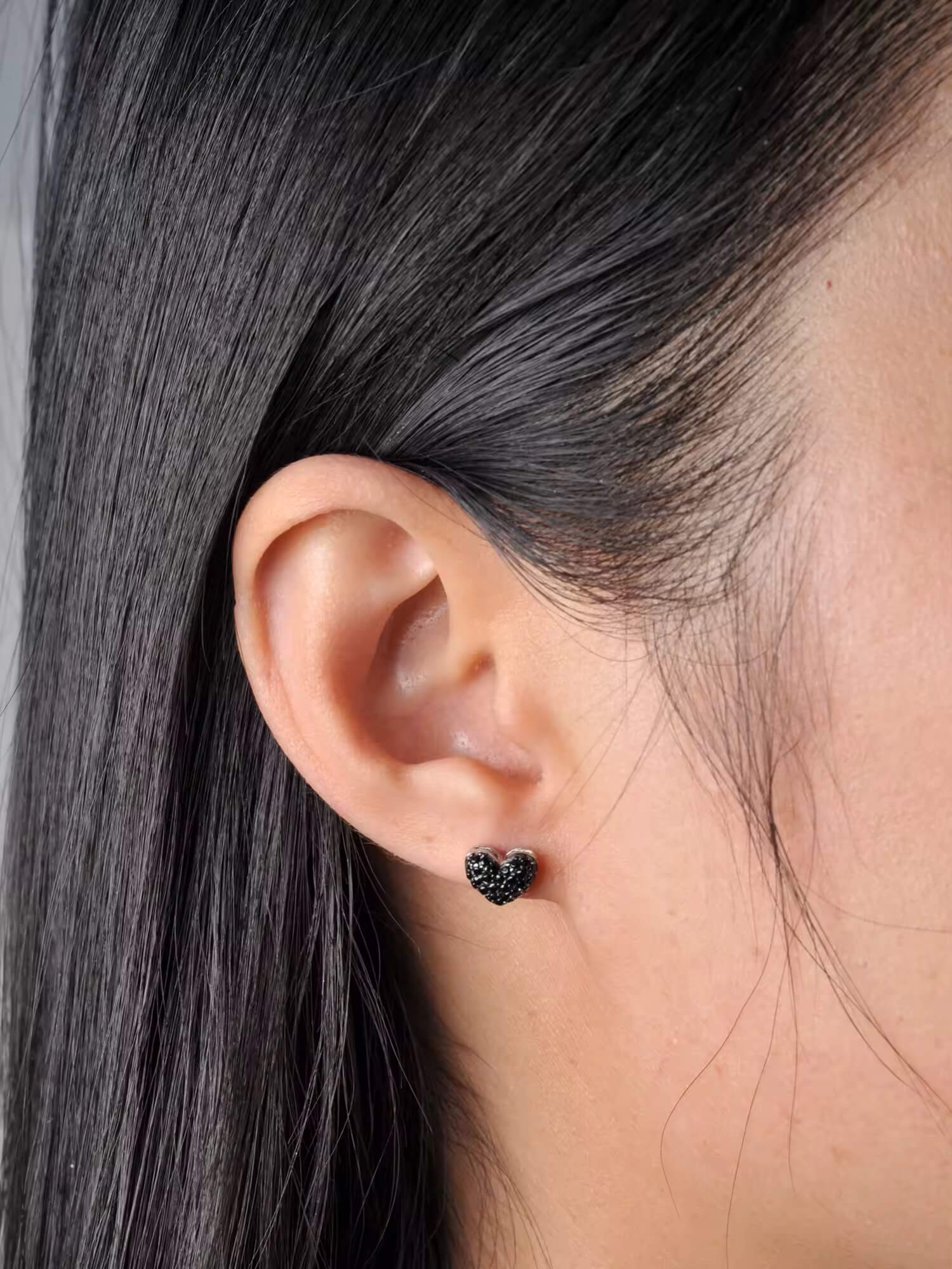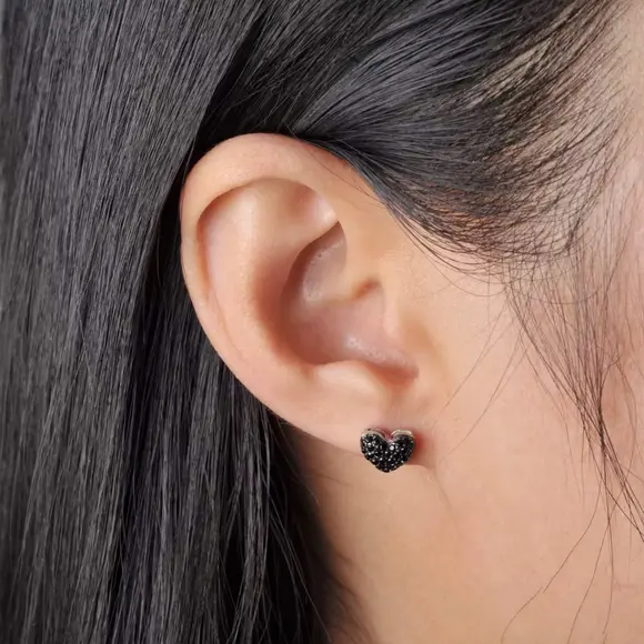 Завдяки компактному формату сережки зручно носити щодня. Вони чудово пасують до мінімалістичних луків, вечірніх образів, total black стилю або як контрастний акцент до світлого одягу. Пусети у формі серця з чорним паве легко поєднуються з іншими прикрасами — каблучками, ланцюжками чи браслетами у схожій стилістиці.