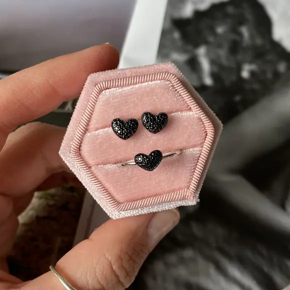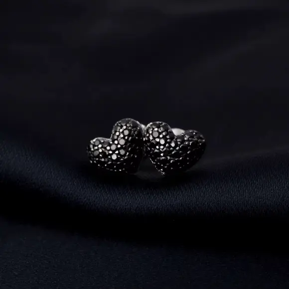 Пусети у формі сердечка з чорним паве — це прикраса з характером, у якій поєднуються символ кохання та сміливий сучасний акцент. Класична форма серця тут звучить по-новому завдяки глибокому чорному паве, що надає сережкам загадковості, драматичності й виразності.