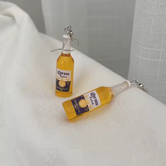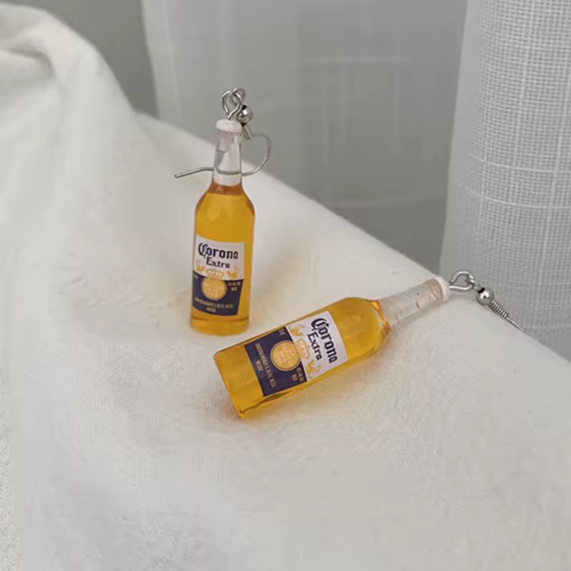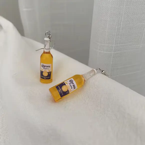 Пляшечки з пивом виглядають напрочуд реалістично: прозора форма, золотистий відтінок «пива», біла етикетка з написом Corona Extra, і навіть лимонна часточка вгорі — усе продумано до дрібниць. Це маленький арт-об'єкт у форматі сережки, який точно викличе усмішку й питання: «Де ти це знайшла?!»