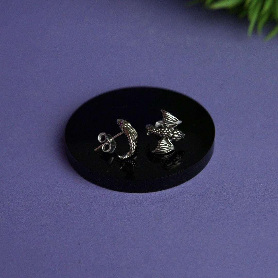 Дизайн сережок натхненний могутніми драконами, які відзначаються вигнутими формами і детальним виконанням. Кожна сережка зображує дракона в динамічній позі, що надає їй величі і загадковості. Майстерно виконані деталі, такі як лускатий текстурований ефект і вражаюча форма, створюють враження справжньої магії і могутності.