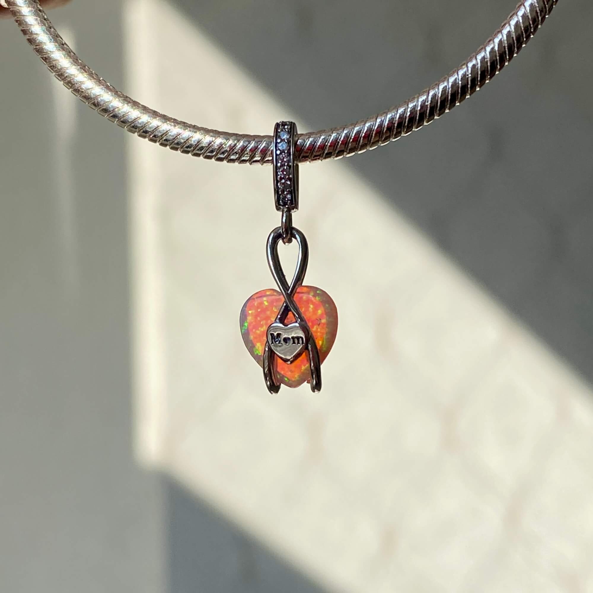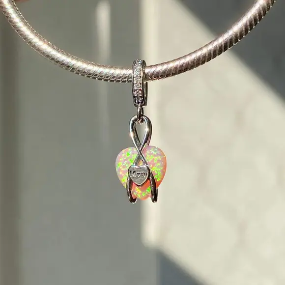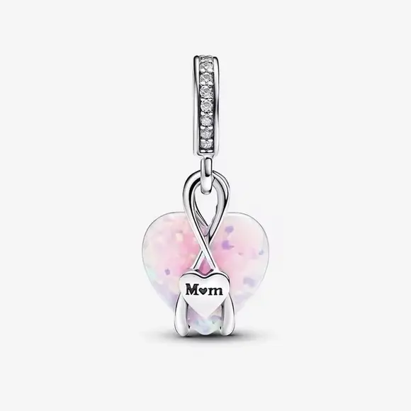 Знак безкінечності, що огортає це серце, символізує нескінченну любов, яка є вічною та незмінною. Маленький сердечний елемент із написом "Mom" завершує композицію, роблячи цей шарм ідеальним подарунком для мами на день народження, День матері або просто як знак уваги.