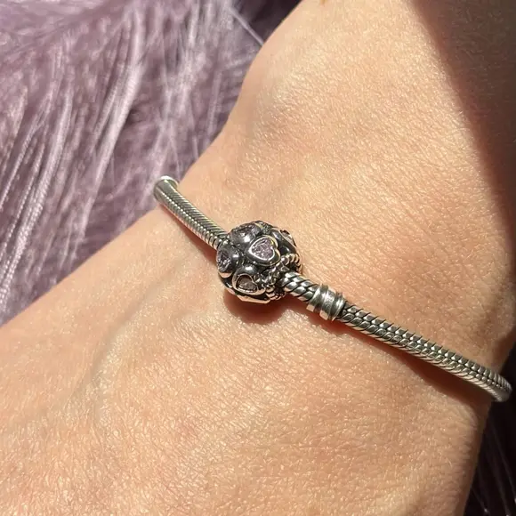 Рожеві серця, що прикрашають цю намистину, відтворюють образи безмежної любові та турботи. Вони символізують ніжність, теплоту та відданість, переносячи вас у світ найніжніших емоцій. Кожне серце на шармі майстерно виконане, що надає прикрасі особливої витонченості та чарівності.