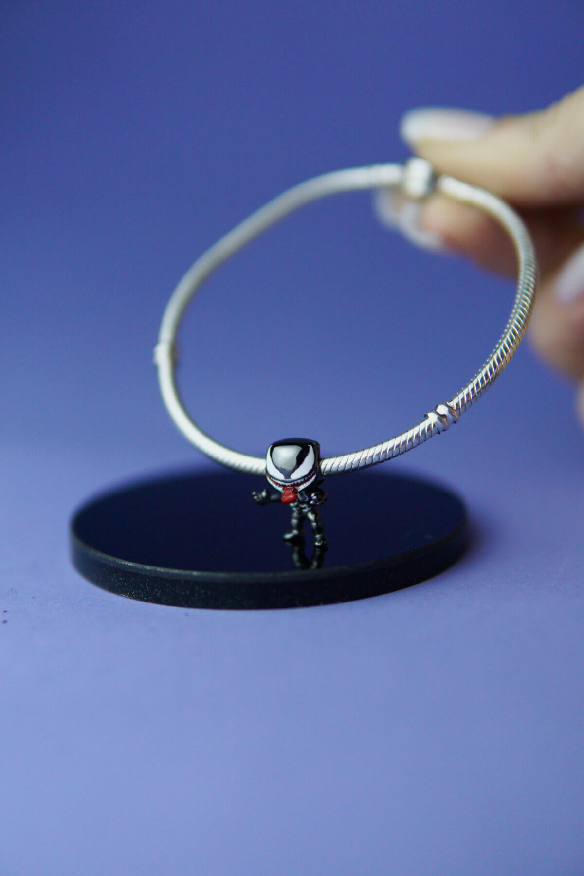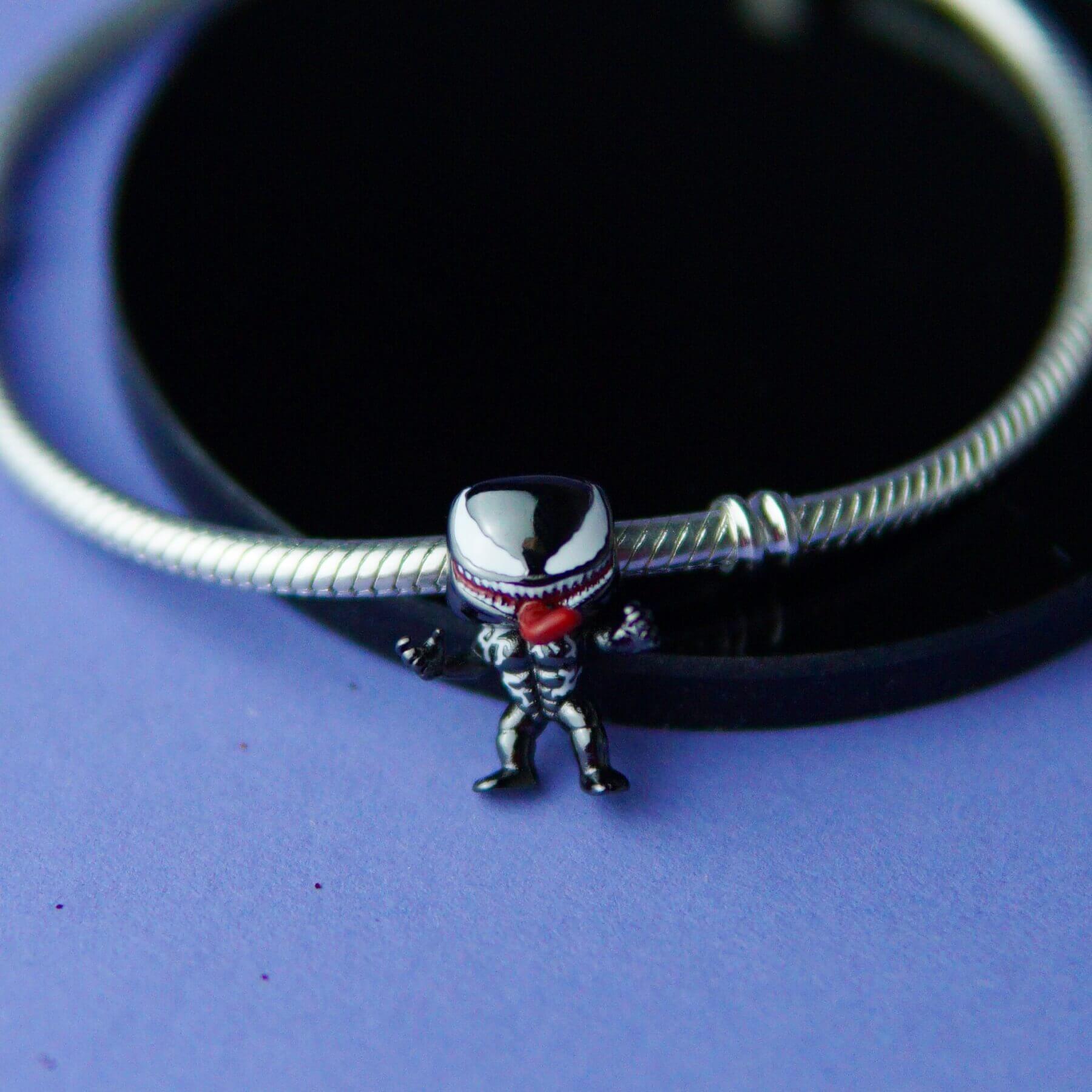 Дизайн прикраси виконаний з ювелірною точністю: об’ємна форма голови Венома, виразні білі очі, глибокий чорний колір і фірмова посмішка з гострими зубами. Завдяки контрастним деталям шарм виглядає реалістично, привертає увагу і додає до браслета яскравого характеру.