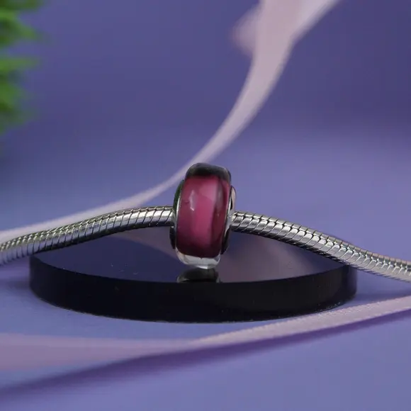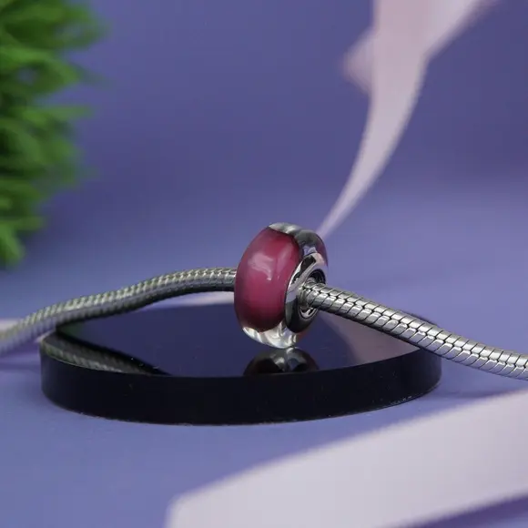 Шарм «Рожеве скло» – це поєднання елегантності, ніжності та мистецької краси. Його основа виготовлена зі срібла 925 проби, що підкреслює високу якість виробу та додає йому довговічності. Головним елементом шарму є розкішне рожеве скло, яке, немов витвір мистецтва, переливається при світлі, створюючи ефект м'якого і чарівного сяйва.