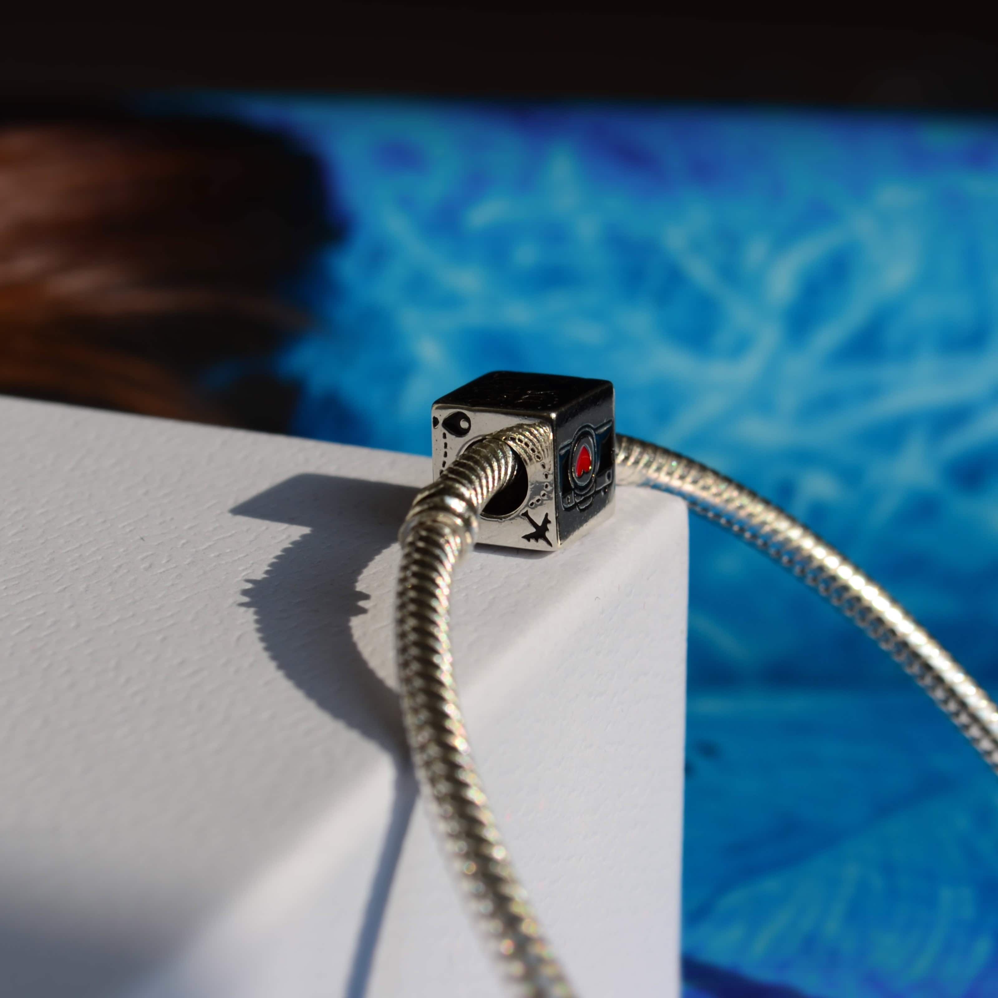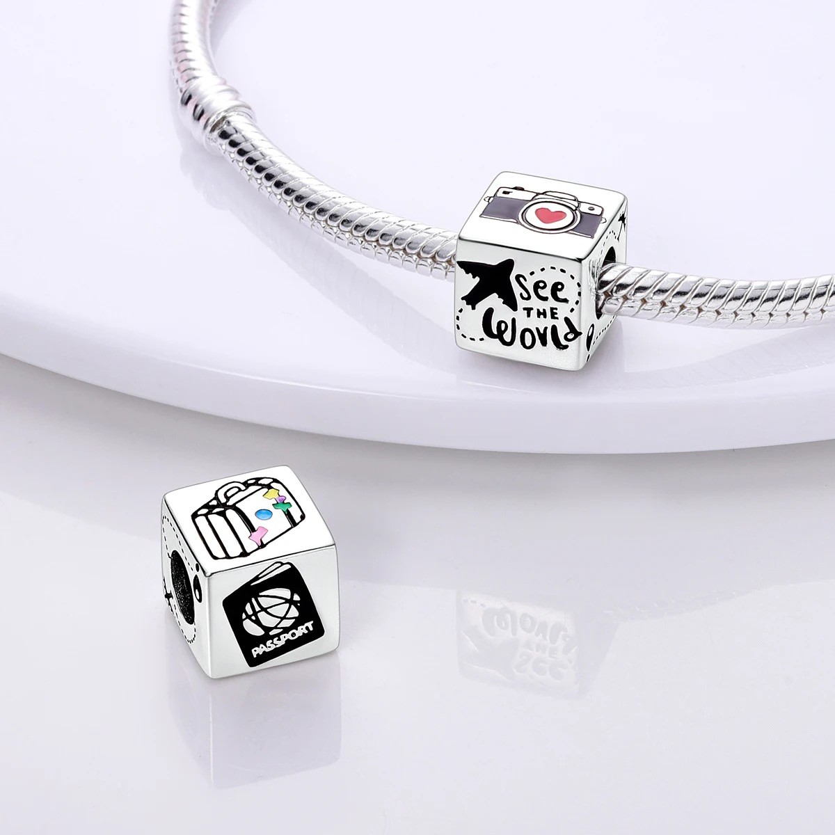 Шарм "See the World" – це маленька пригода, втілена в елегантному кубику. Відчуйте дух подорожей і відкриттів, додавши цей унікальний аксесуар до вашої колекції прикрас. Кожна грань цього шарму розповідає про різні аспекти захоплюючої подорожі: фотоапарат, закордонний паспорт, валіза та літак – все, що потрібно для незабутньої мандрівки.