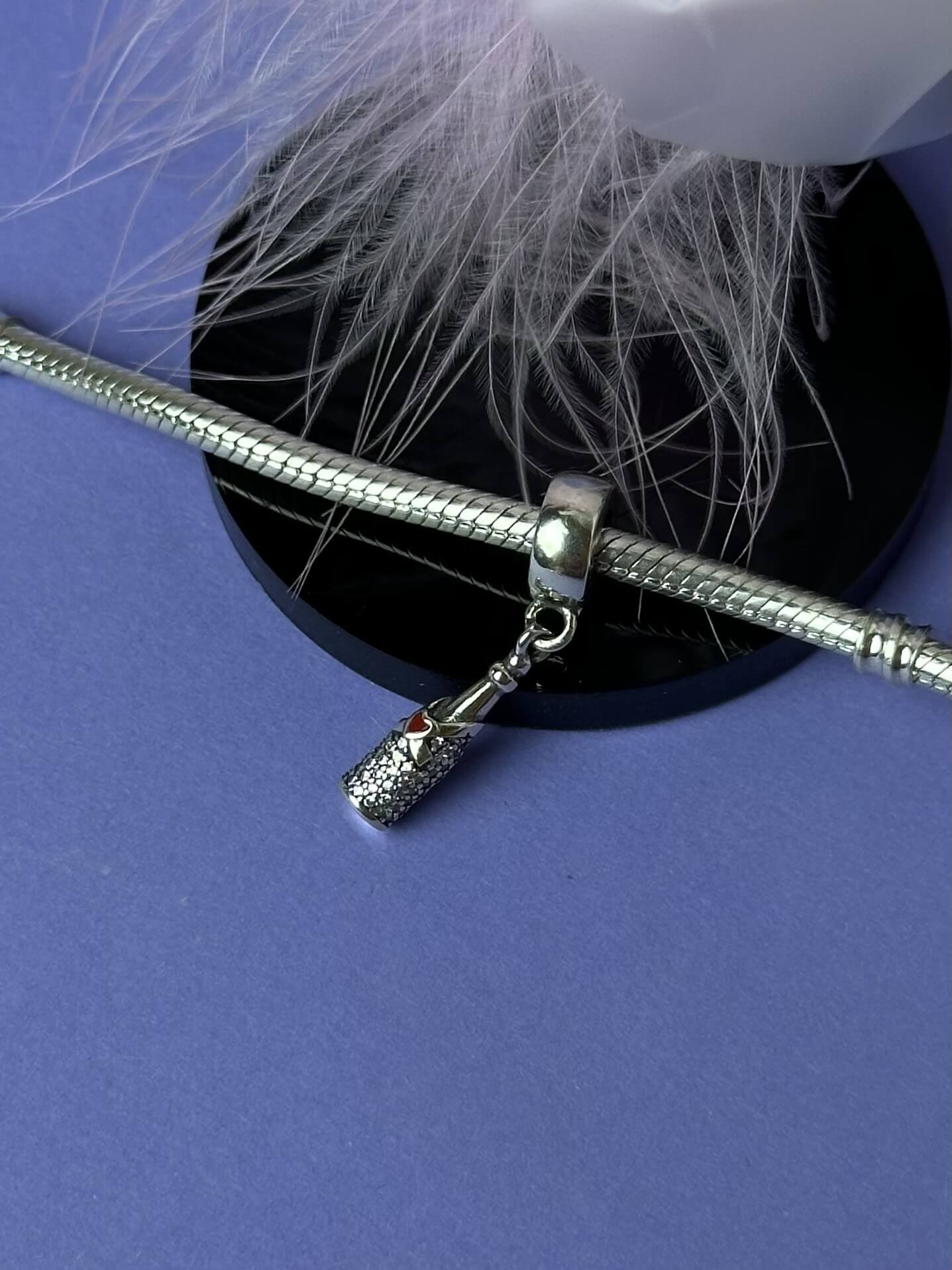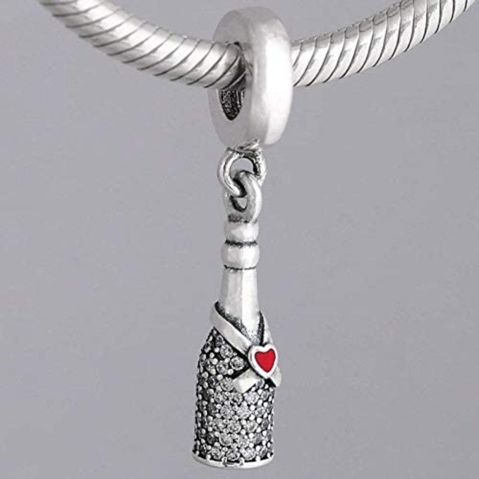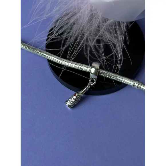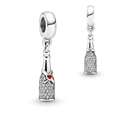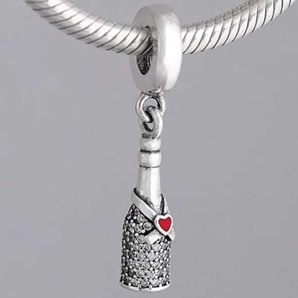 Дизайн шарму витончений та елегантний. Він зображає мініатюрну пляшку шампанського, яка, здається, готова ось-ось відкритися, наповнюючи повітря радістю і святковою атмосферою. Деталі, такі як етикетка на пляшці та пробка, підкреслюють увагу до дрібниць, що робить цей шарм справжнім витвором мистецтва. Сріблястий блиск і витончена форма роблять цей аксесуар неповторним.