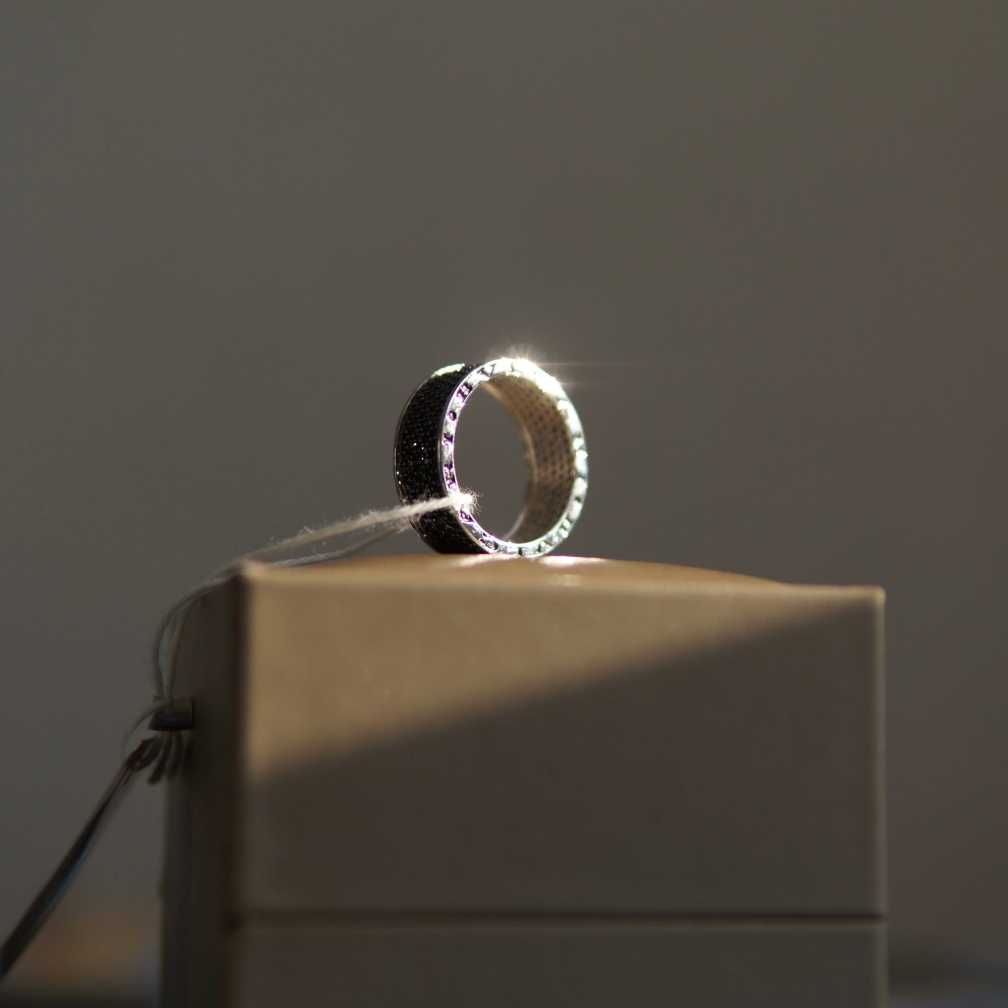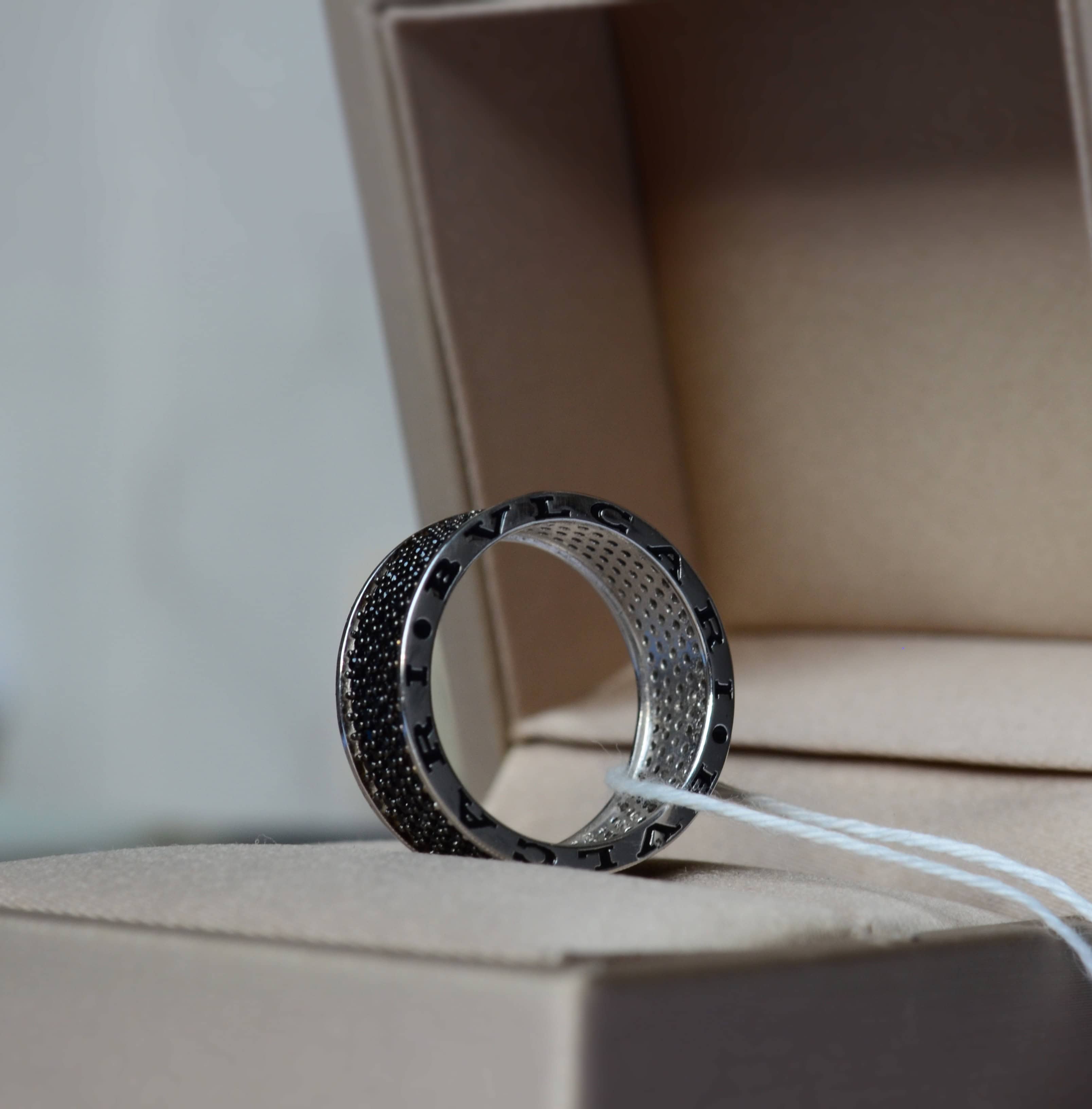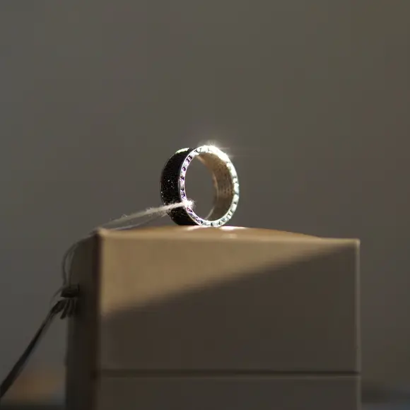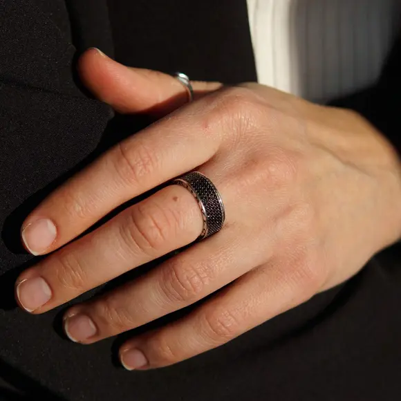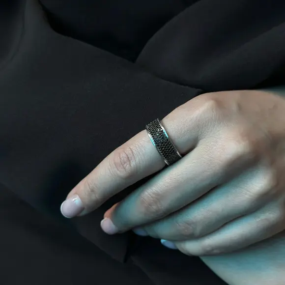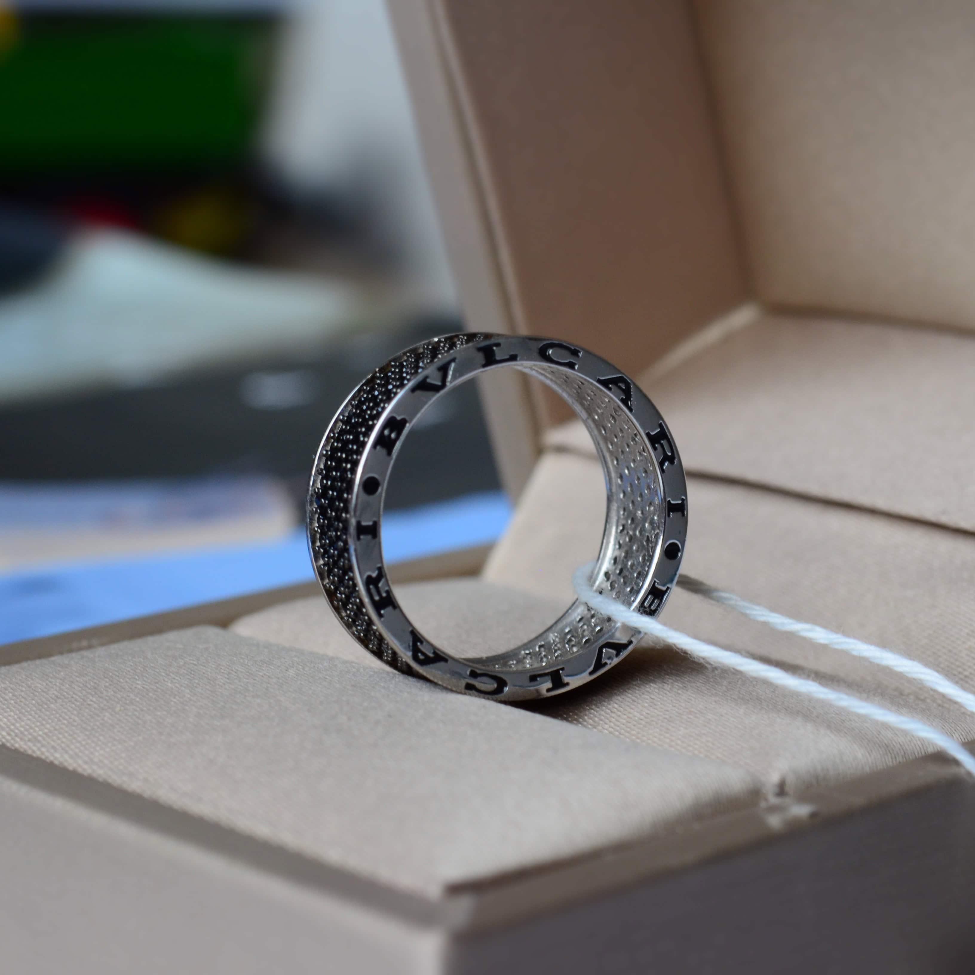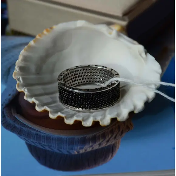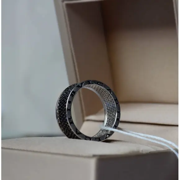 Головним елементом виробу є ретельно розташовані чорні камінці, які надають виробу загадковості і виразного блиску. Чорний колір символізує силу, впевненість і глибину, а їх ефектне розміщення створює відчуття безмежного сяйва, яке підкреслює кожен рух руки. Додатково, класичний дизайн каблучки, натхненний легендарним стилем BVLGARI, відкриває новий рівень розкоші, що поєднується з сучасною естетикою.