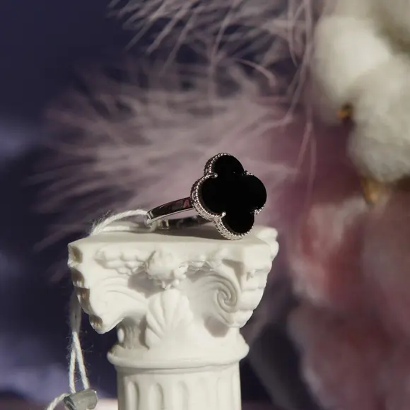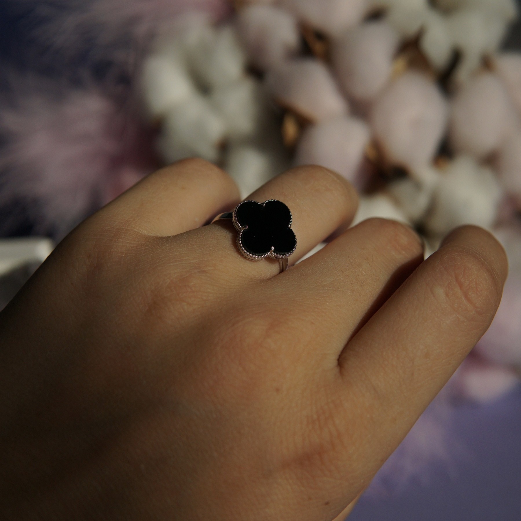 Срібна каблучка «Конюшина» з оніксом у стилі Van Cleef – це втілення справжньої вишуканості та елегантності, яка підкорює своїм неповторним дизайном. Натхненна легендарним брендом Van Cleef & Arpels, ця каблучка переносить класичний символ удачі у світ сучасної моди та естетики.