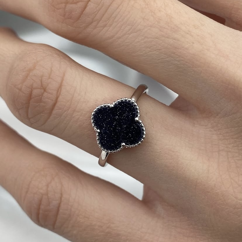 Срібна каблучка-квітка з авантюрином «Ніч Каїру» у стилі Van Cleef — це прикраса, яка поєднує гармонію природи та магію нічного неба. Її форма натхненна легендарною колекцією Alhambra від Van Cleef & Arpels, де квітковий силует уособлює удачу, ніжність і жіночність.