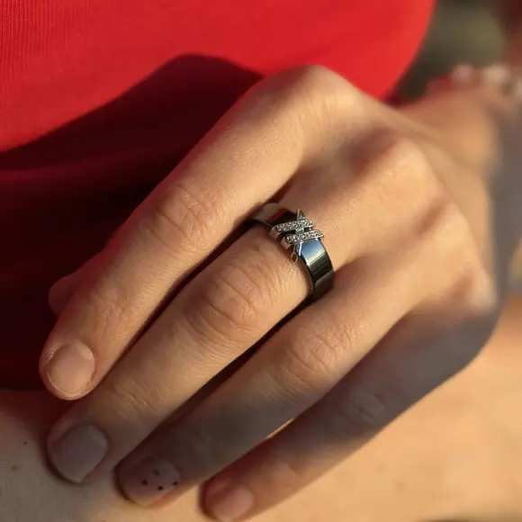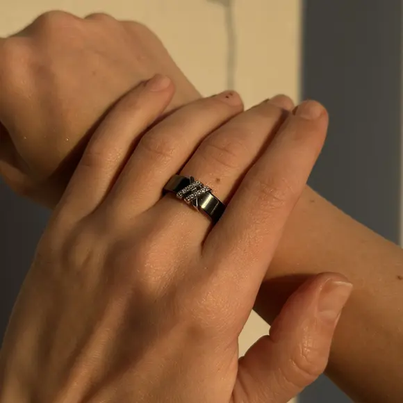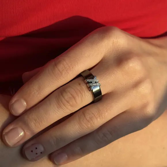Чорна керамічна каблучка гладка об'ємна з срібною вставкою