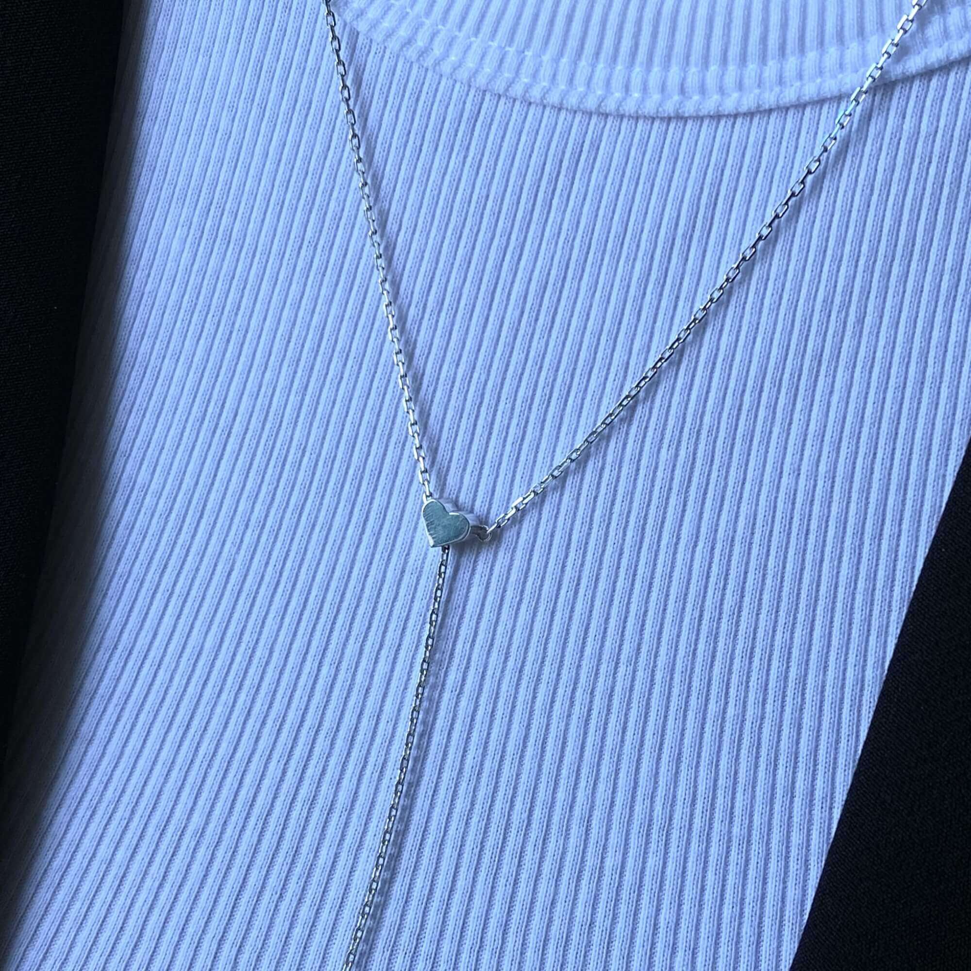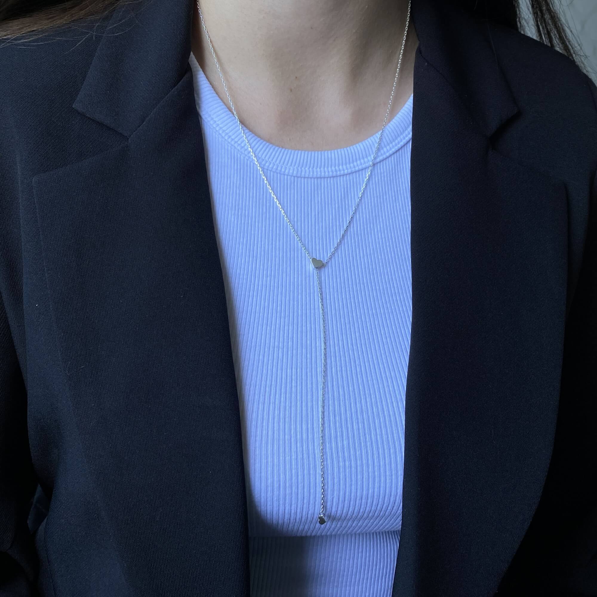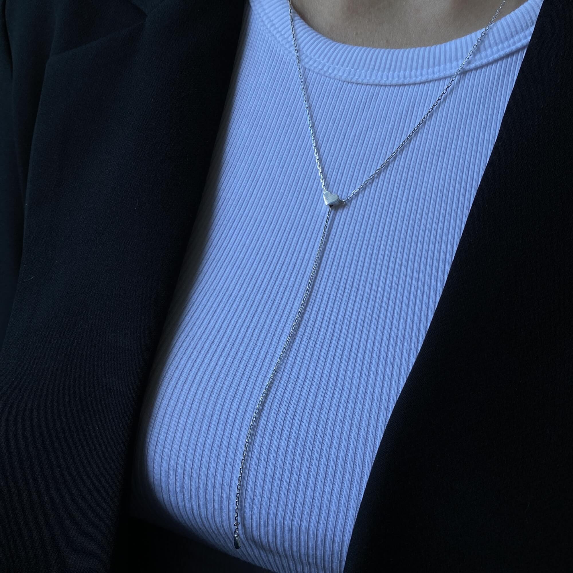 Срібна підвіска-краватка з сердечком, що регулюється — це прикраса, яка поєднує романтичну символіку та сучасну універсальність. Її дизайн натхненний формою краватки, що елегантно спадає вздовж шиї, витягує силует і додає образу вишуканої вертикальної лінії. Центральний акцент — мініатюрне сердечко, яке м’яко вловлює світло та привертає погляд.