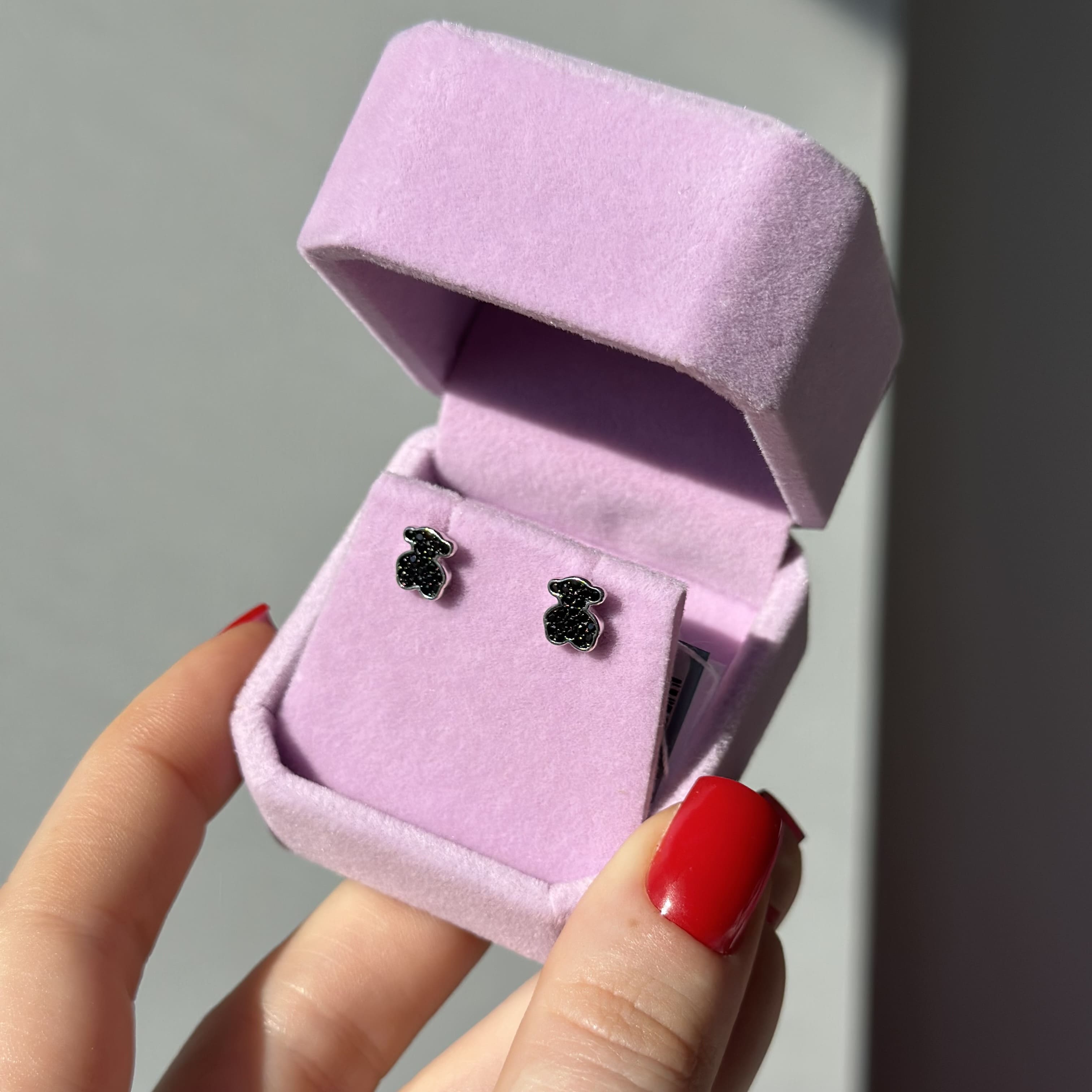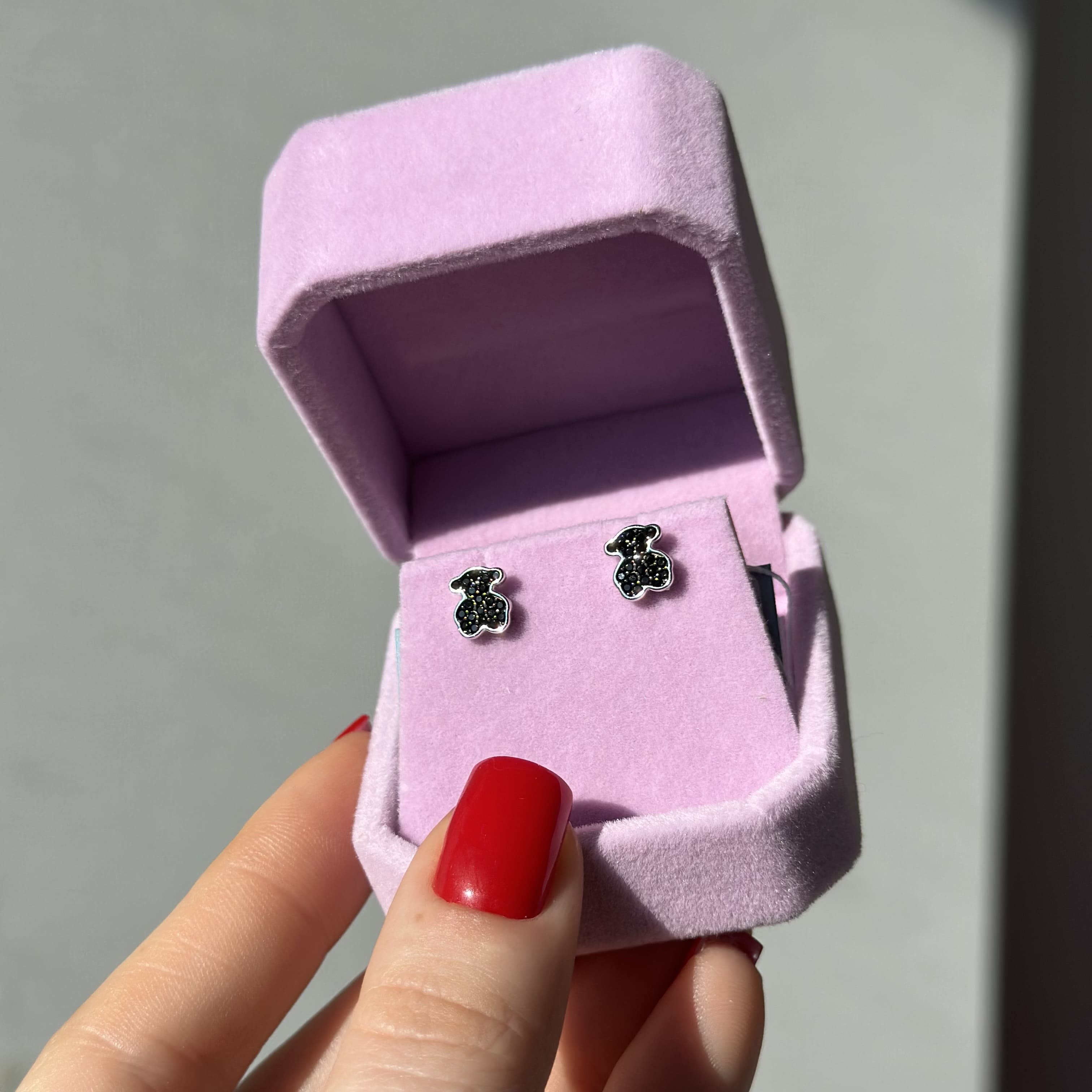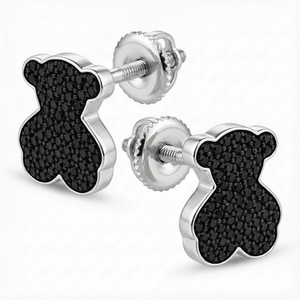 Срібні сережки в стилі "Tous" з чорними фіанітами