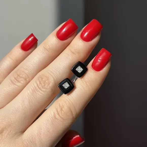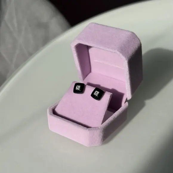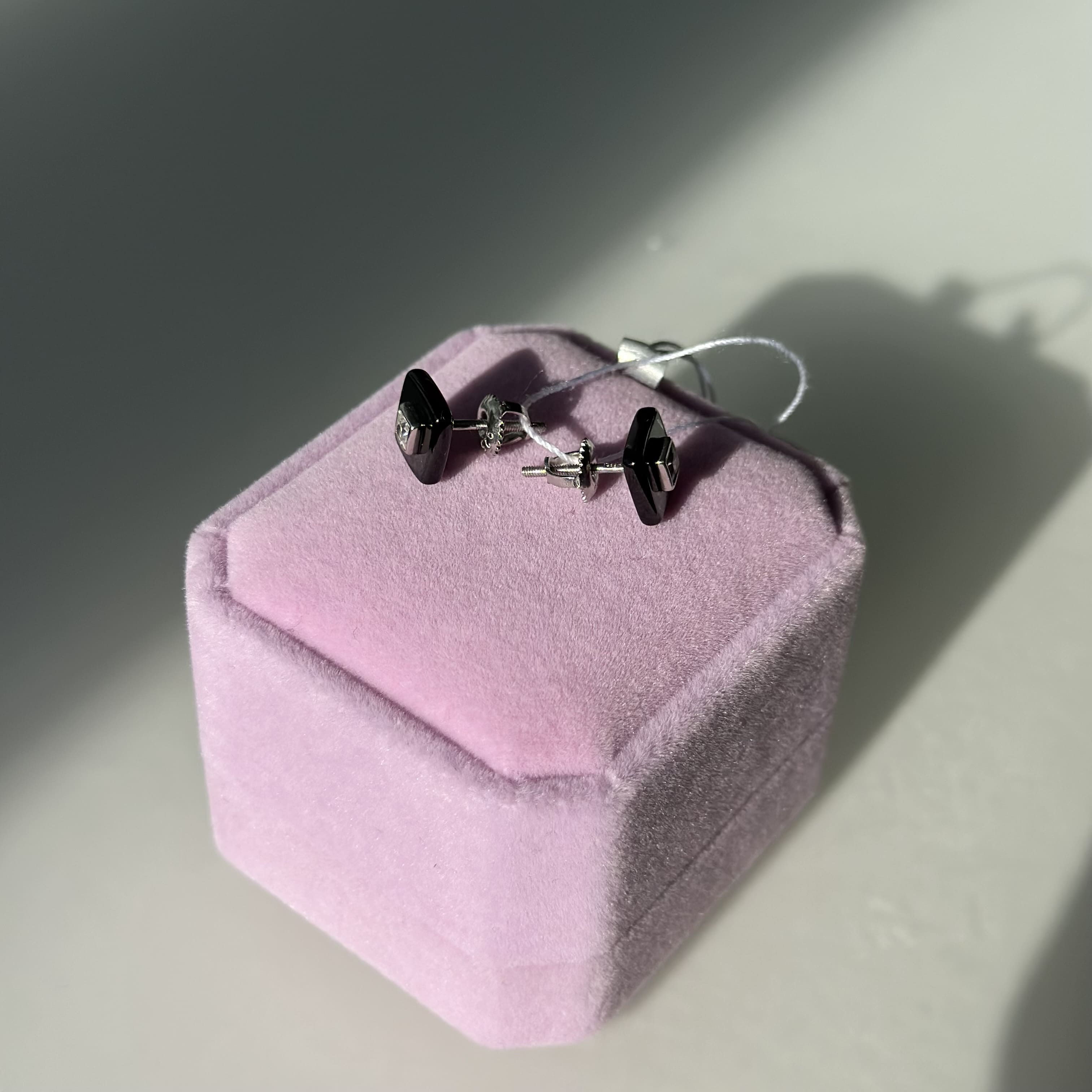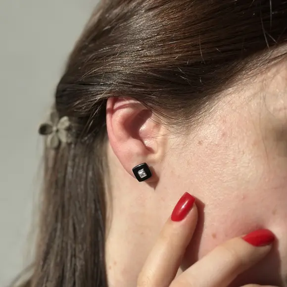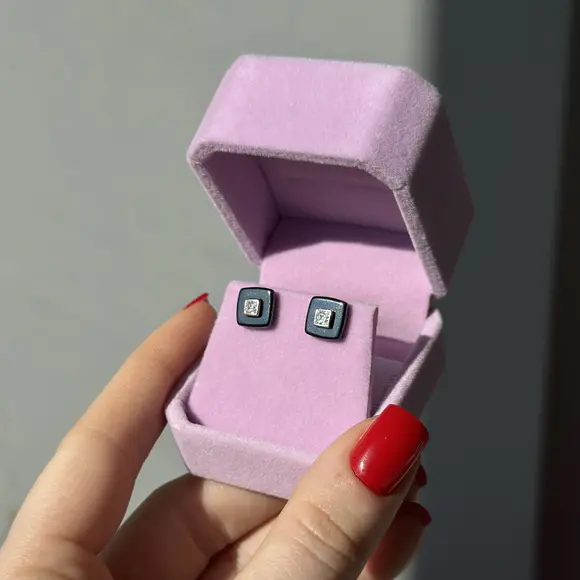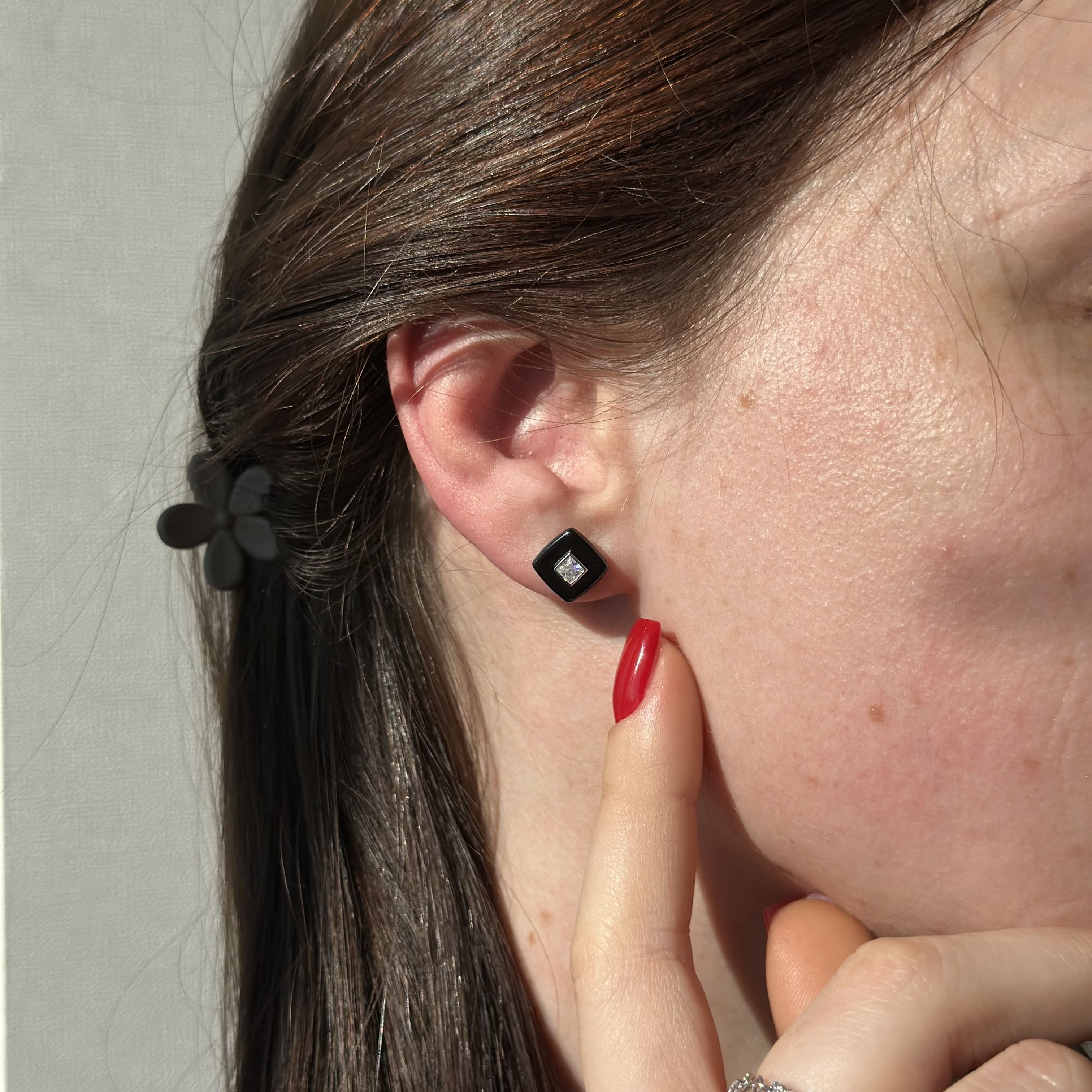 Чорні керамічні пусети квадрат з срібною вставкою та фіанітами