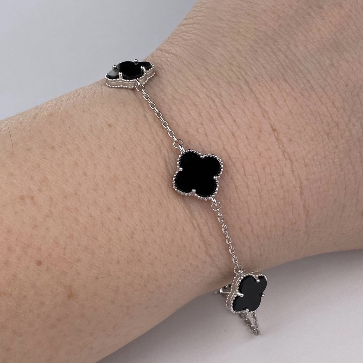 На браслеті розташовані чотири квітки-конюшини, інкрустовані чорним оніксом. Камінь має глибокий, насичений колір, що підкреслює елегантність і додає прикрасі універсальності. Онікс традиційно вважають каменем внутрішньої сили й впевненості — він чудово підходить тим, хто цінує баланс між стриманістю і виразністю.