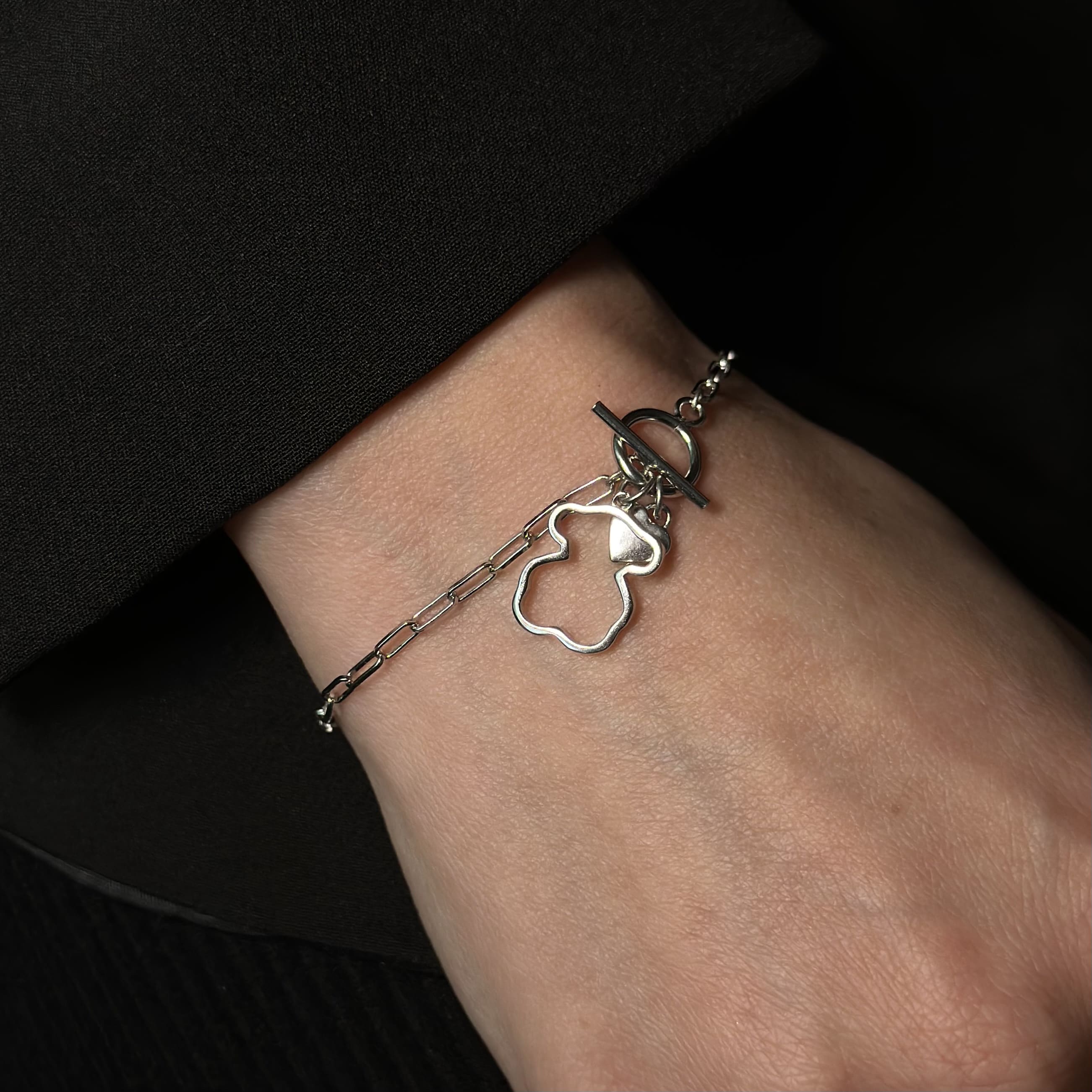 Срібний браслет у стилі “Tous” з підвісками — це легка, грайлива прикраса з характерним настроєм ніжності та молодіжної елегантності. Дизайн натхненний впізнаваною естетикою милих символів, плавних форм і витончених ліній, що роблять образ теплішим і більш особистим.