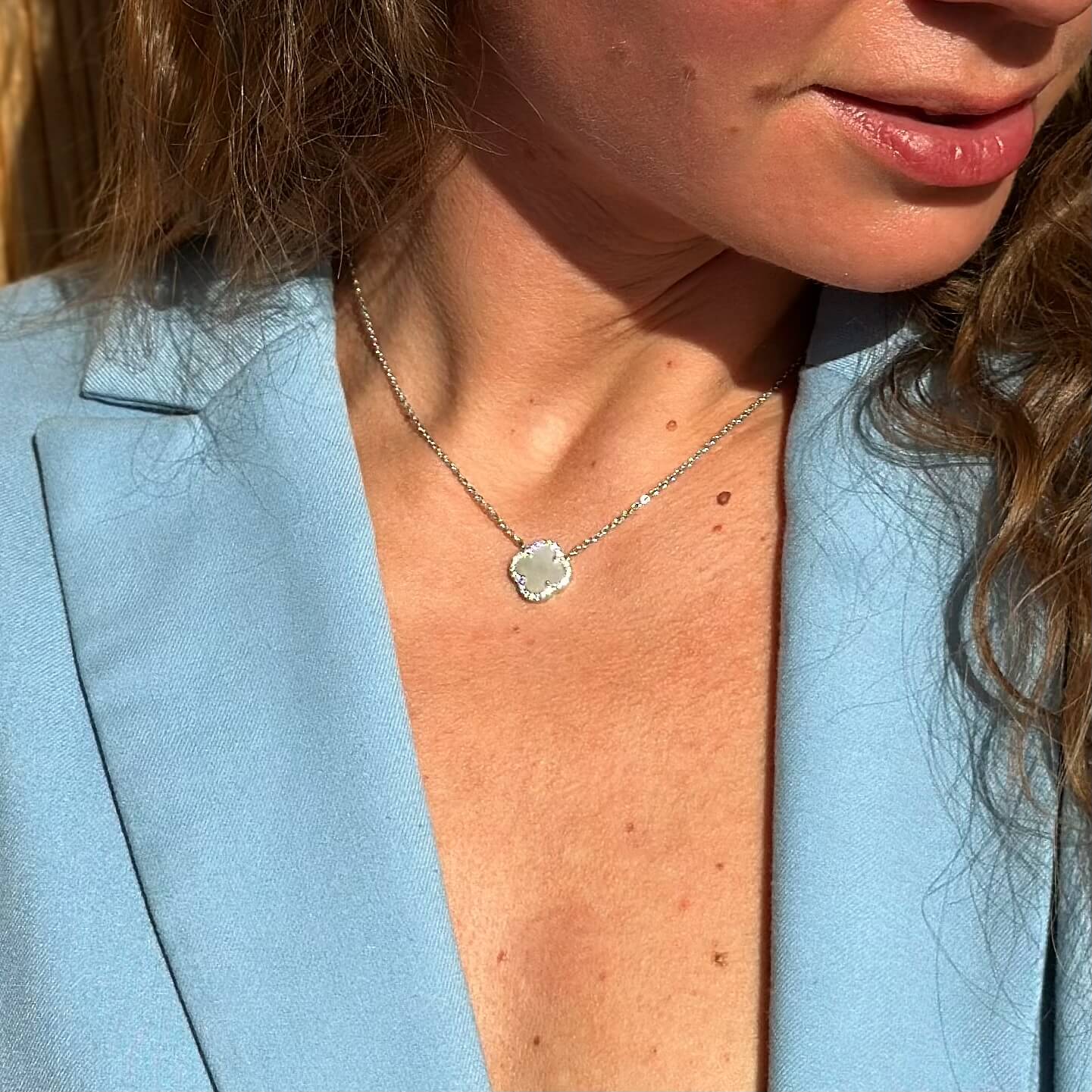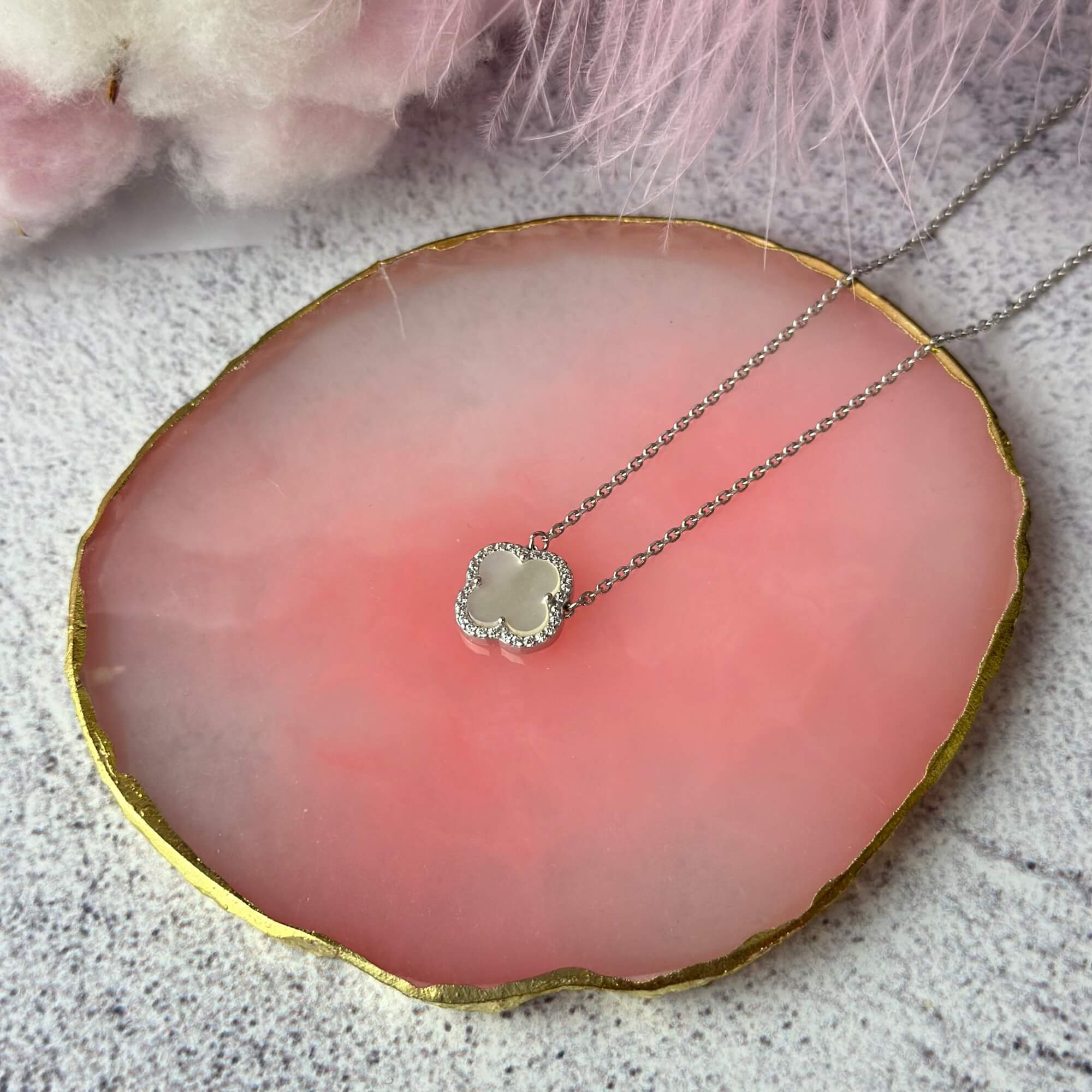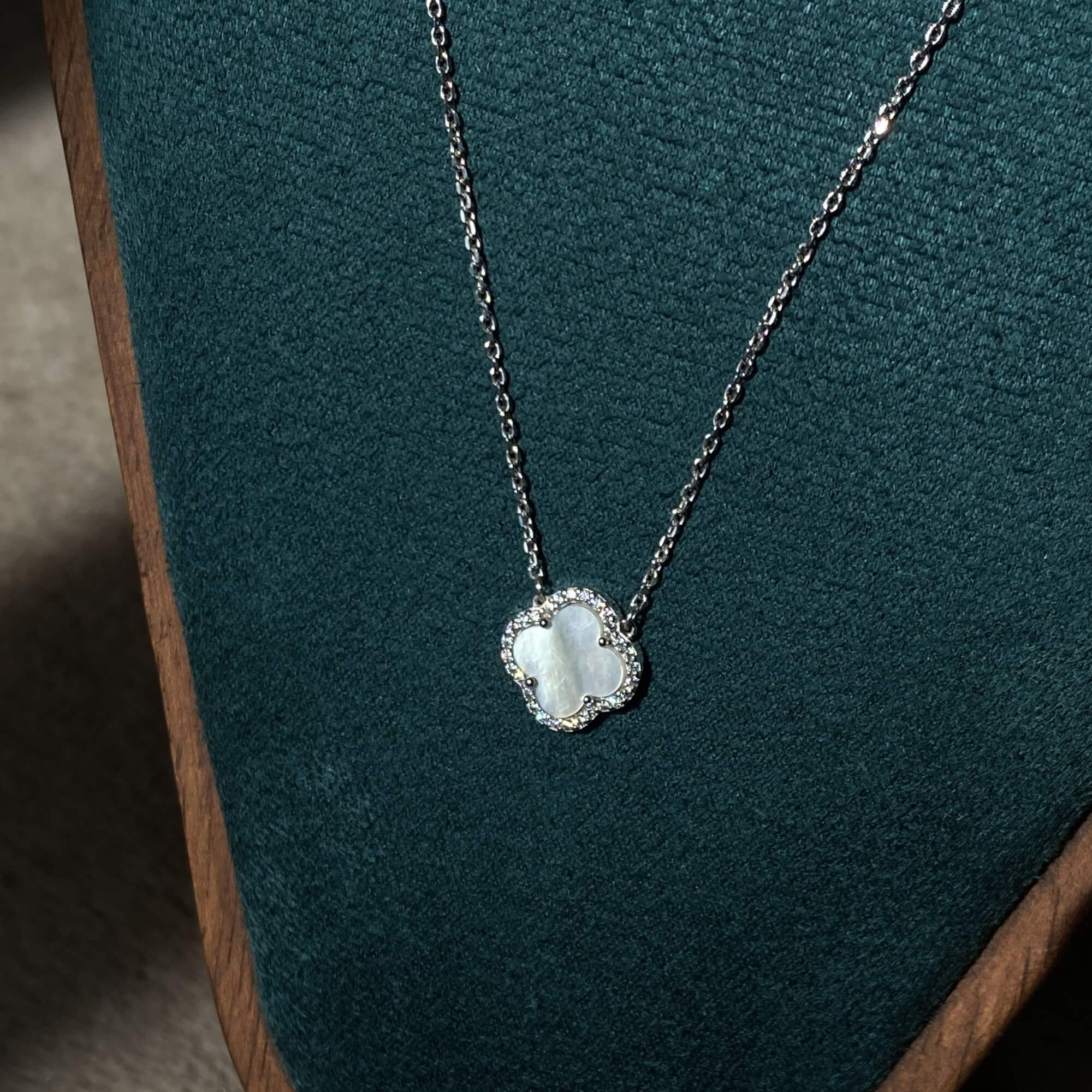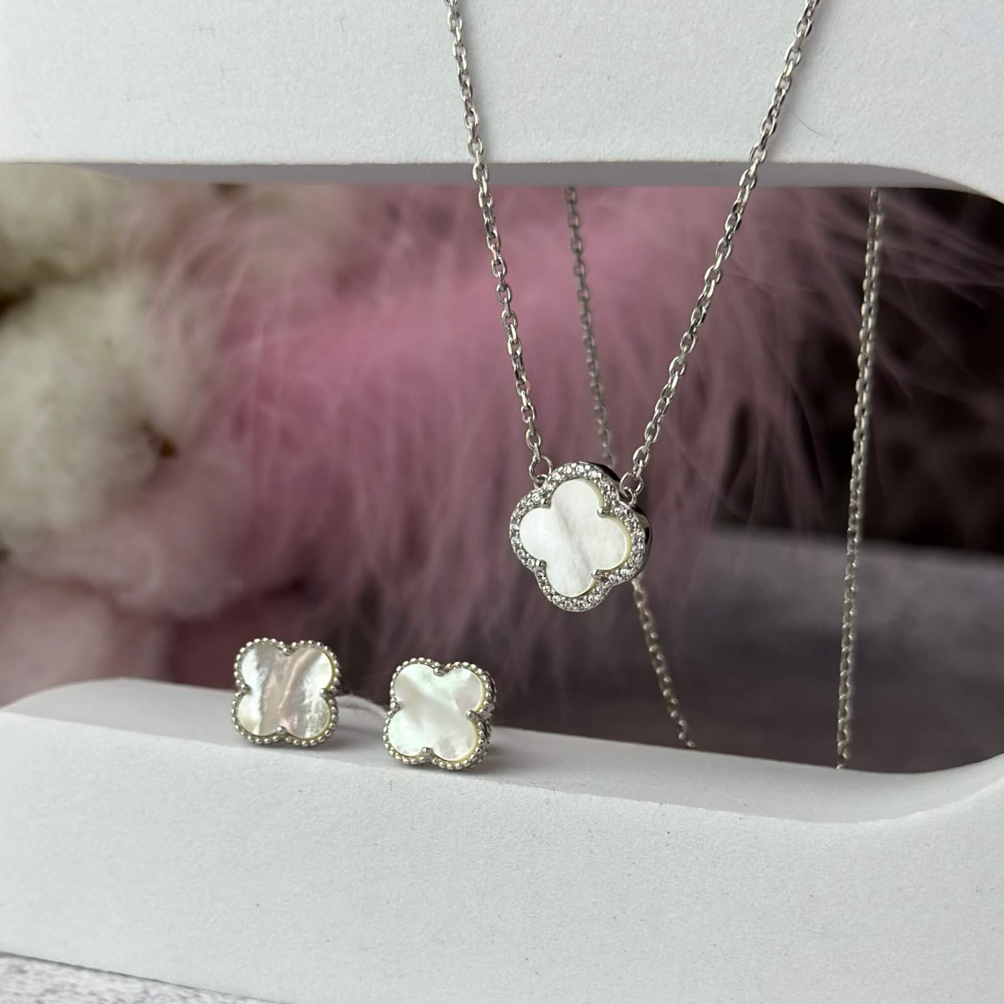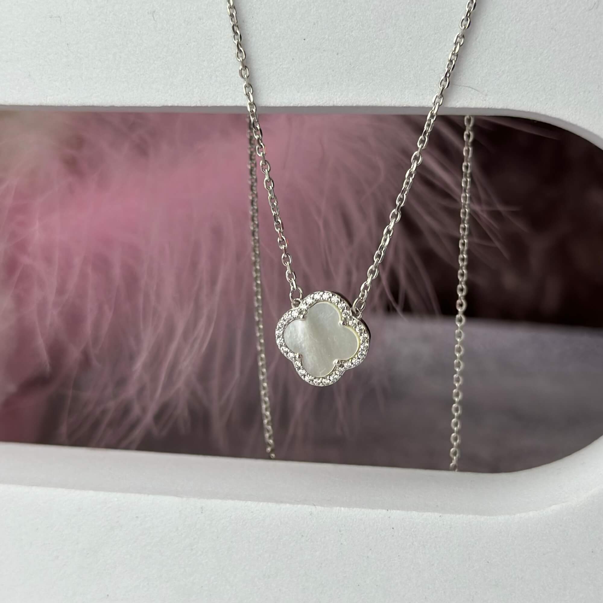 Центральним елементом є підвіска у формі чотирилисткової квітки, виконана з перламутру. Перламутр відомий своїм м’яким природним сяйвом, яке змінюється залежно від освітлення, створюючи ефект живого блиску. Він асоціюється з жіночністю, гармонією та внутрішнім спокоєм, а у поєднанні з лаконічною формою виглядає особливо благородно.