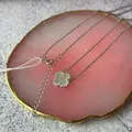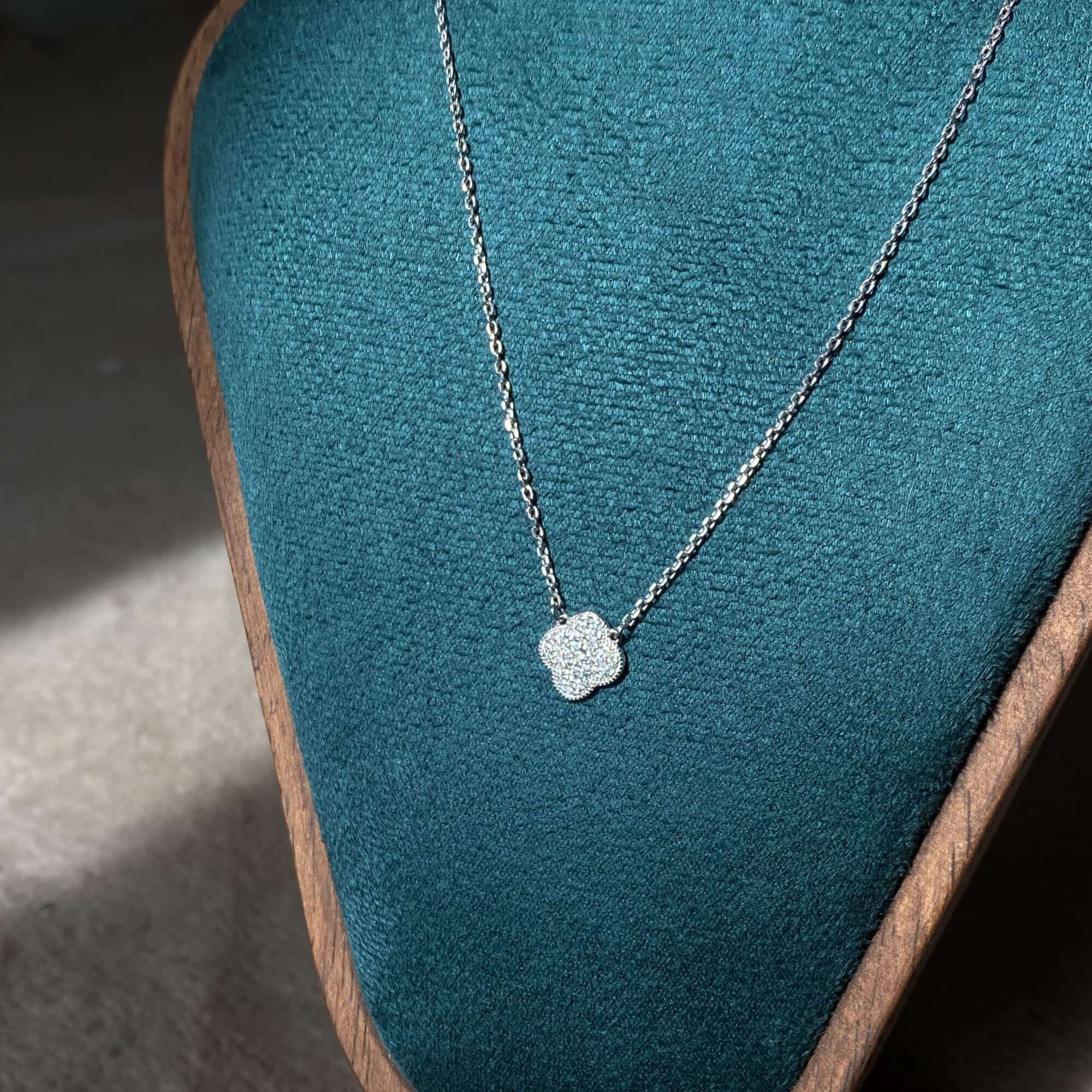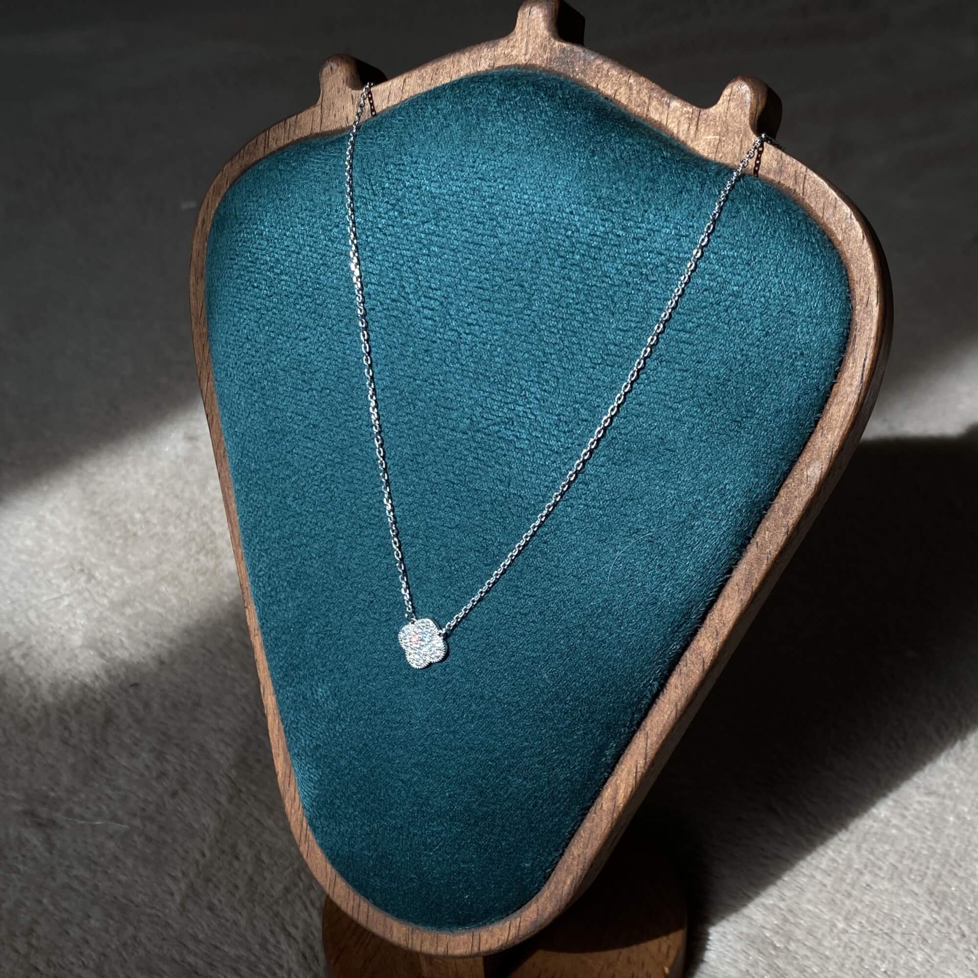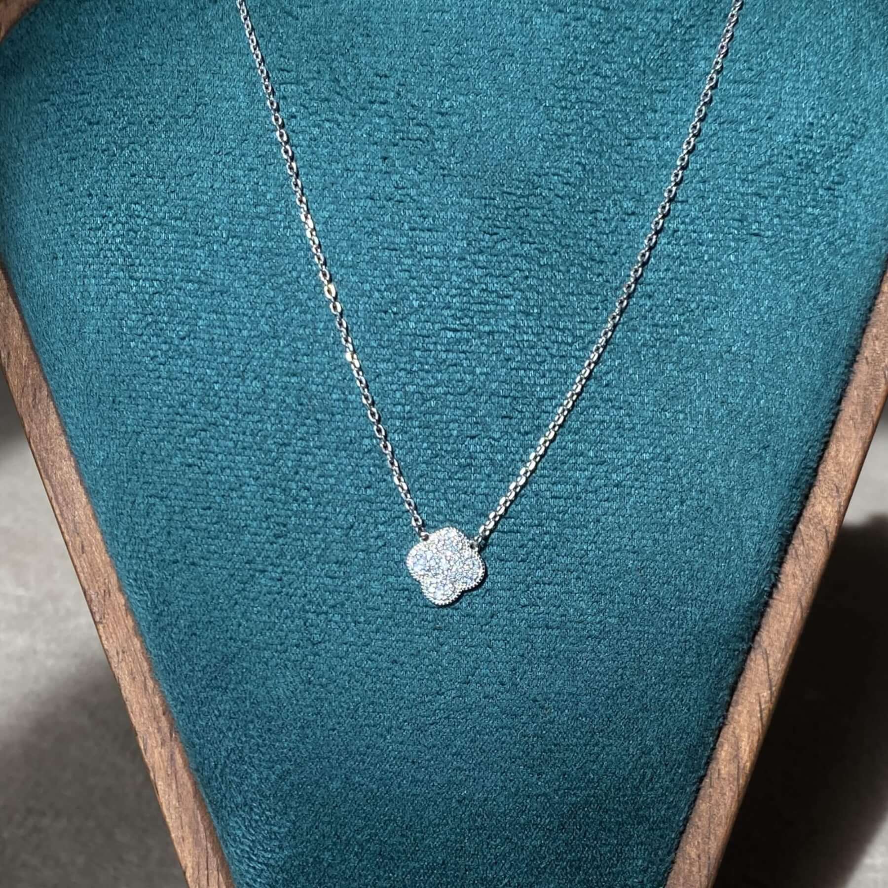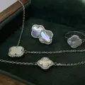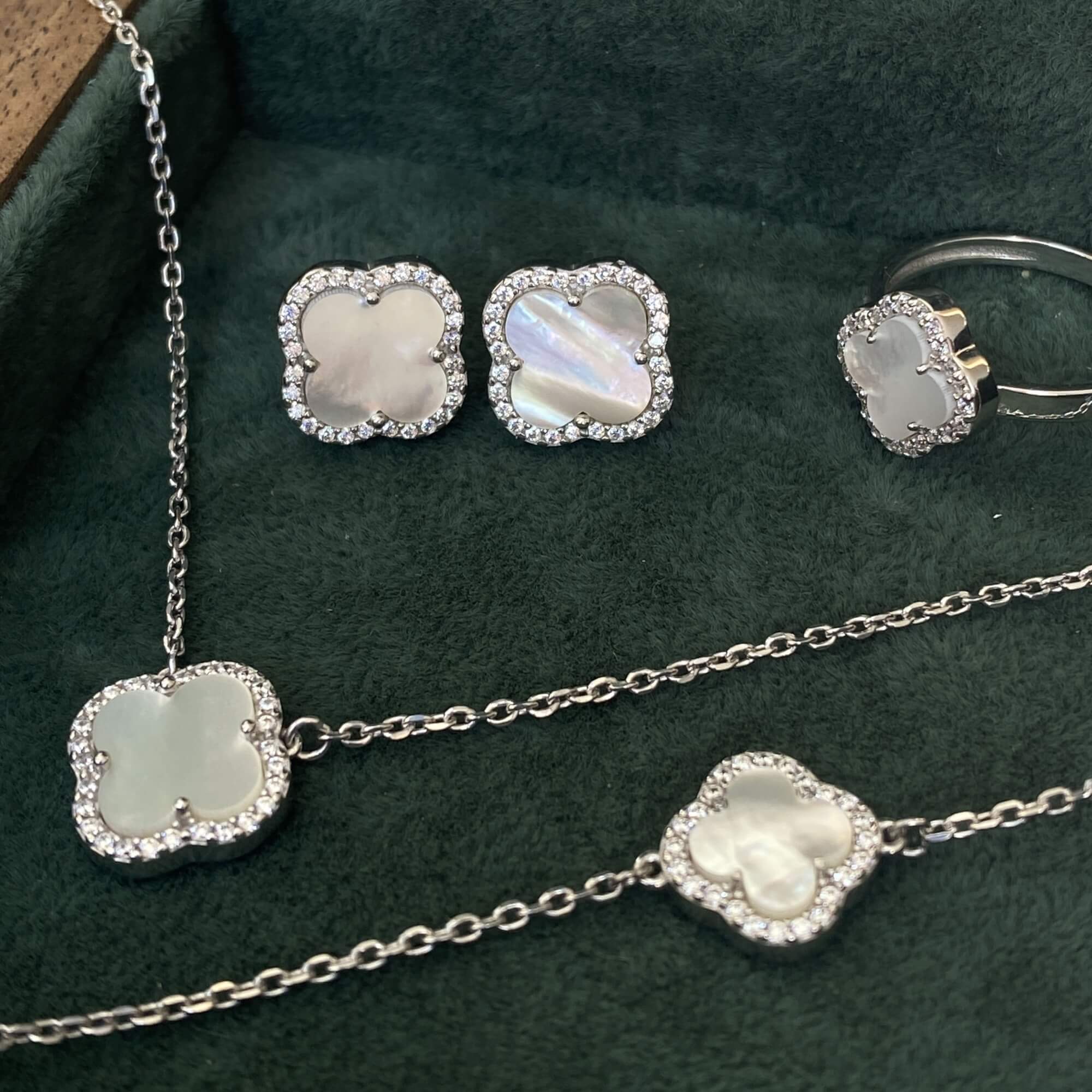 Центральним елементом є підвіска у формі чотирилисткової квітки, виконана з перламутру. Перламутр відомий своїм м’яким природним сяйвом, яке змінюється залежно від освітлення, створюючи ефект живого блиску. Він асоціюється з жіночністю, гармонією та внутрішнім спокоєм, а у поєднанні з лаконічною формою виглядає особливо благородно.